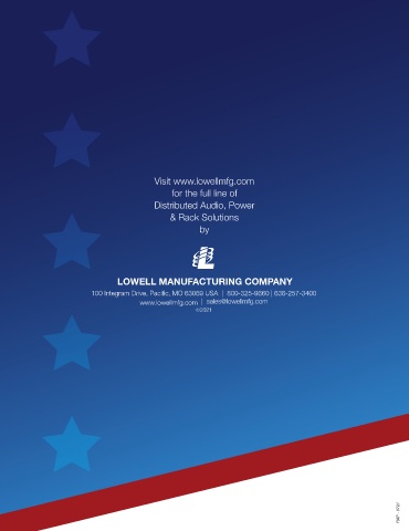 Visit www.lowellmfg.com for the full line of Distributed Audio, Power & Rack Solutions by LOWELL MANUFACTURING COMPANY 100 Integram Drive, Pacific, MO 63069 USA | 800-325-9660 | 636-257-3400 www.lowellmfg.com | sales@lowellmfg.com ©2021 RAP - 0721