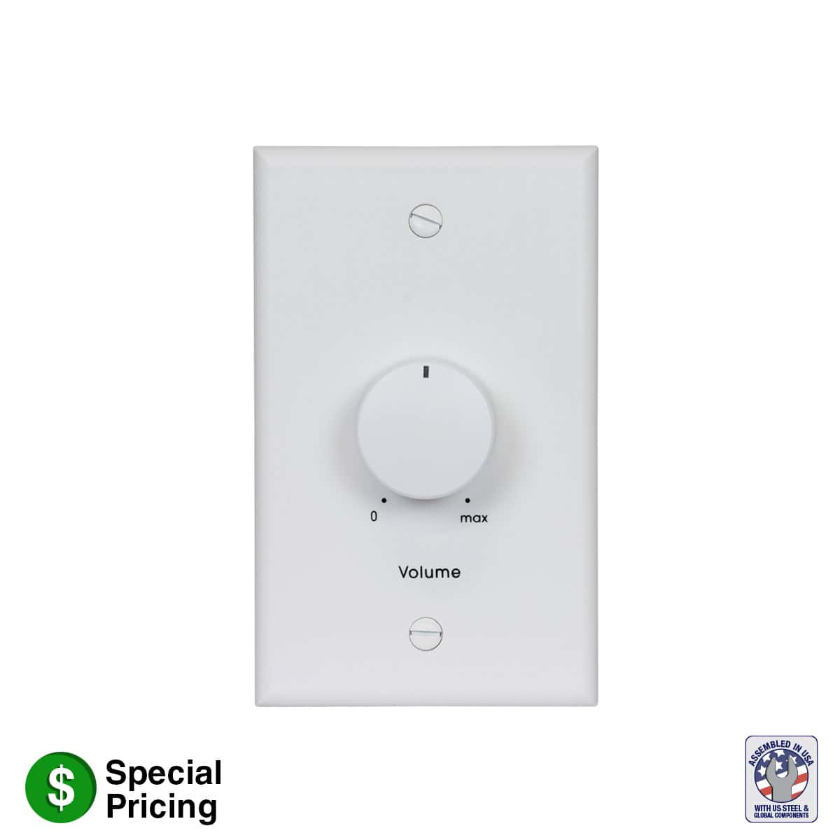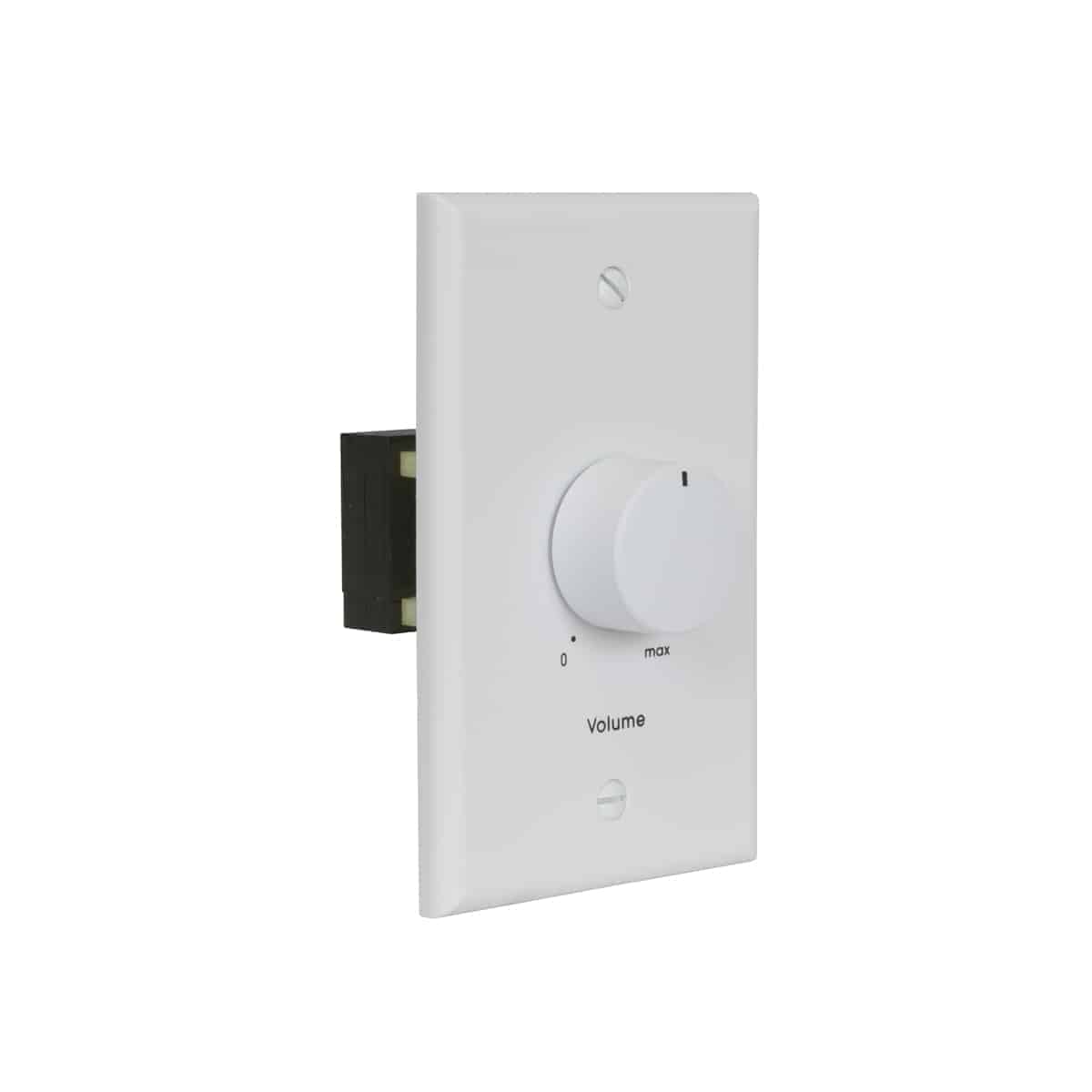 Mono autoformer attenuator volume control with rotary switch is for use with 25V/70V speaker line. This volume control features Phoenix style plug-in screw termination strips, 100W power rating and precise 1.5dB per step attenuation. Includes standard one-gang white wall plate.