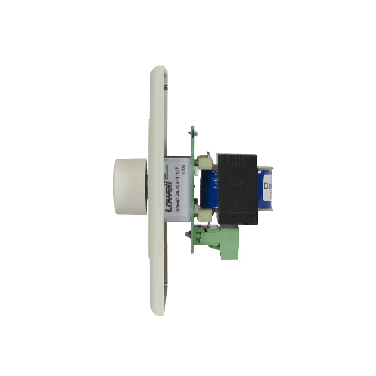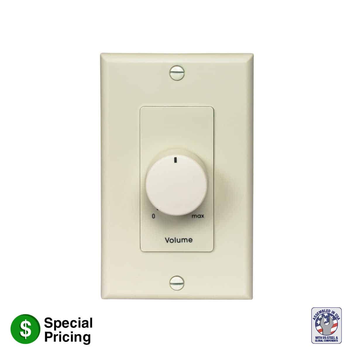 Mono autoformer attenuator volume control with rotary switch is for use with 25V/70V speaker line. This volume control features Phoenix style plug-in screw termination strips, 100W power rating and standard 3dB per step attenuation. Includes decorator style one-gang almond wall plate.