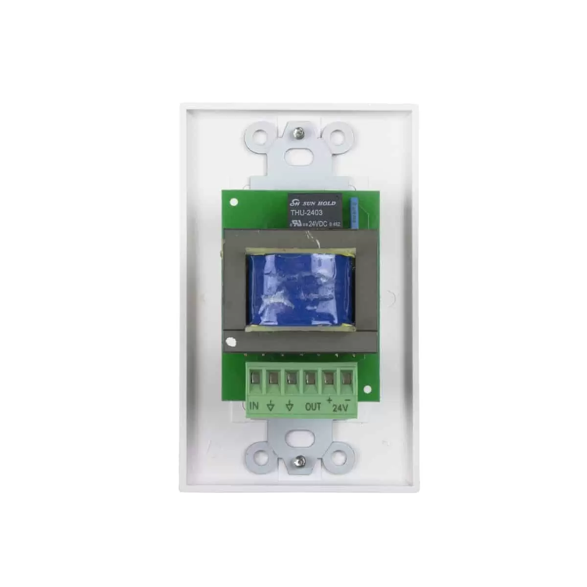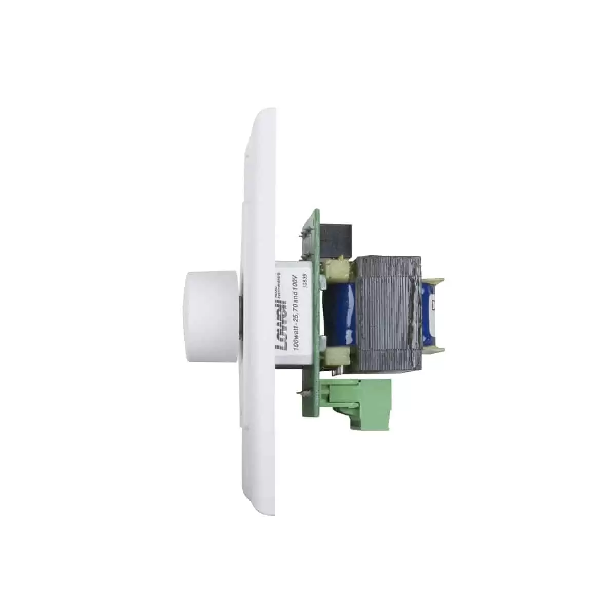 The ETL Listed (UL60065, UL2043) volume control shall be Lowell Model No. 100LVC-PA-DW with 100W power rating, 3dB per step attenuation, and 24VDC@15mA relay for applications that require emergency and paging signals to bypass/override the attenuator. It shall include a decora-style one-gang wall plate with white finish. The device shall mount in an EO box with minimum inside dimensions of 1.875 in. x 2.688 in. x 2.125 in. (box not included). It shall be Assembled in USA with global components. The control shall be ETL Listed and Trade Agreement Act (TAA) compliant.