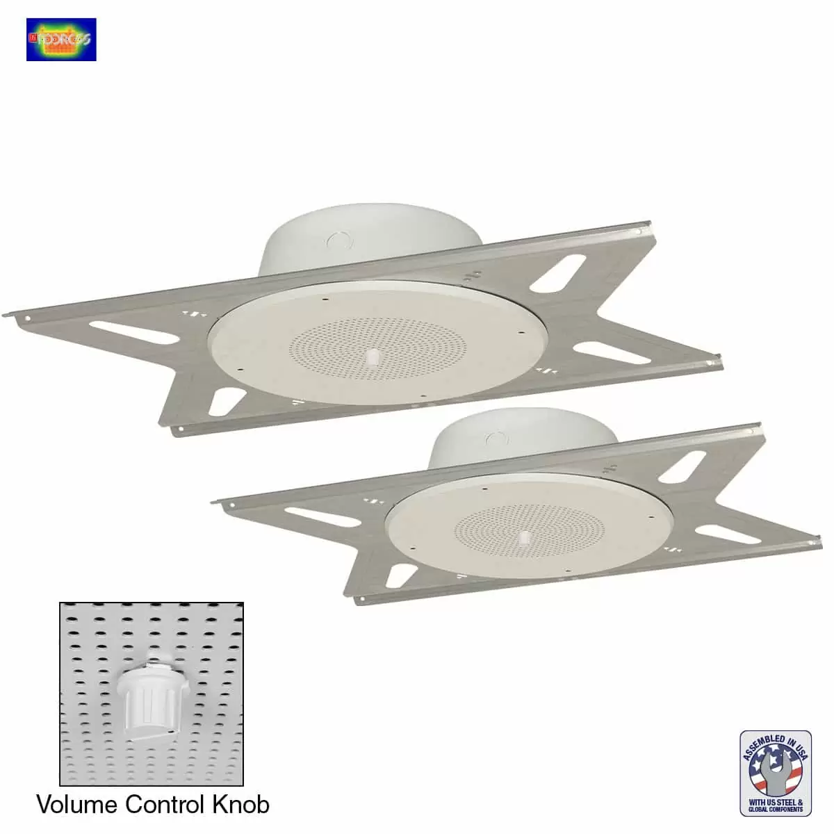 The 8-inch ceiling speaker kit shall be Lowell Model RPAK- 810-72K which shall include two 8″ dual cone drivers with wired dual voltage transformers and mounted white steel grilles boxed with two enclosures and two tile-bridges to transfer the speaker assembly weight to the ceiling support structure in suspended tile ceilings. The driver shall have an RMS power rating of 15W and employ a 10oz. ceramic magnet and molded high fiber cone. Frequency response shall be 51Hz-11.6kHz (±6dB) and 50Hz-20kHz (±6.6dB) with sensitivity of 97.9dB average measured 1W/1M. The transformer shall be 25V/70V with primary taps at .25, .5, 1, 2, and 5W. The grille shall be steel with white powder coat finish and volume control knob in center. The steel enclosure shall measure 10 in. diameter x 4 in. deep with 1/2–3/4 in. knockouts for conduit and a white powder coat finish. The tile-bridges shall be 23.75 in. long galvanized steel with holes for seismic anchoring.