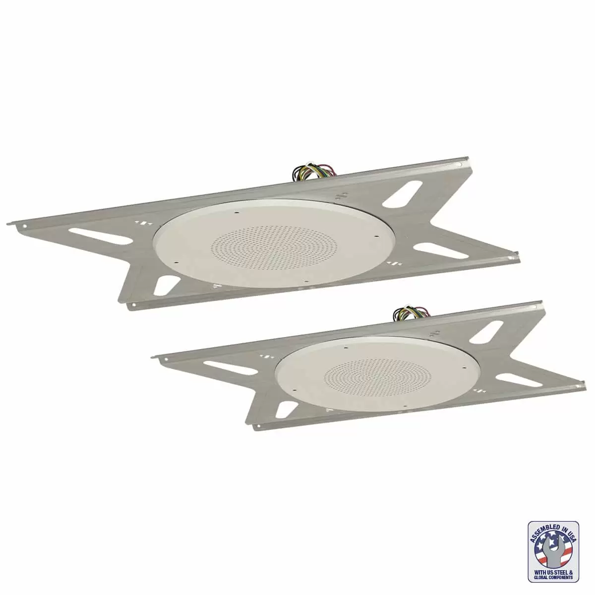 Model RPAK-810-72-LC, for general purpose paging and background music, includes a set of two (2) 8-inch 15W dual cone speakers with factory-mounted dual-voltage (25V/70V) transformers, round steel grilles, and tile-bridges.
