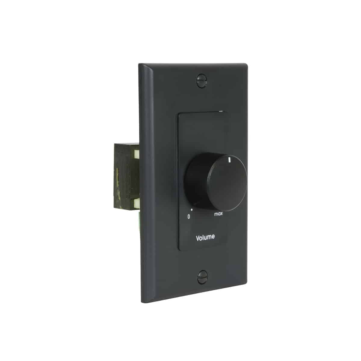 Mono autoformer attenuator volume control with rotary dial for use with 25V/70V speaker line features 25W power rating, 3dB per step attenuation (two steps of 6dB each before off) and phoenix-style plug-in screw termination strips. Includes decora-style one-gang black wall plate.
