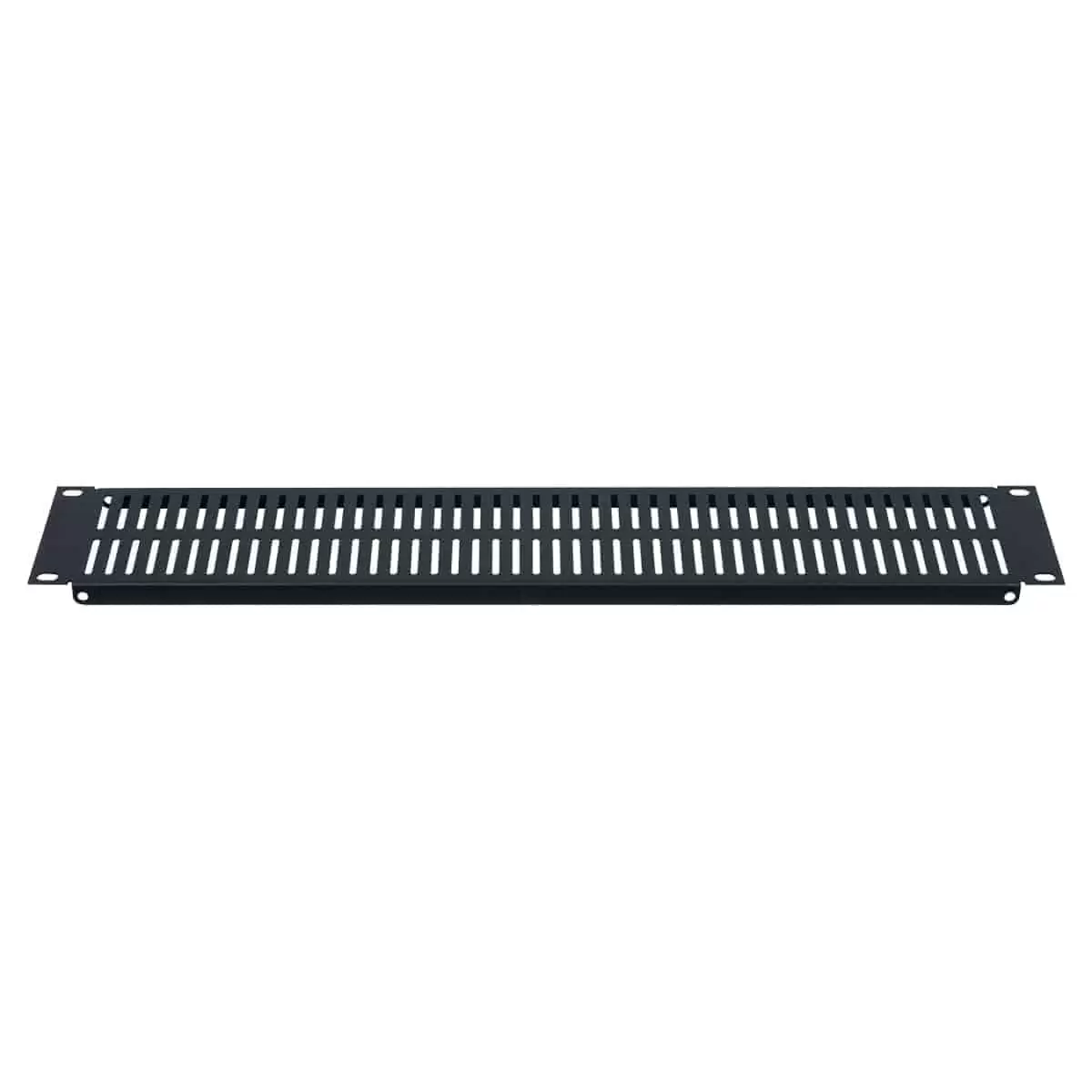 Blank aluminum panel for 19-inch racks and cabinets features ventilation slots, flange for added strength, and brushed black anodized finish.