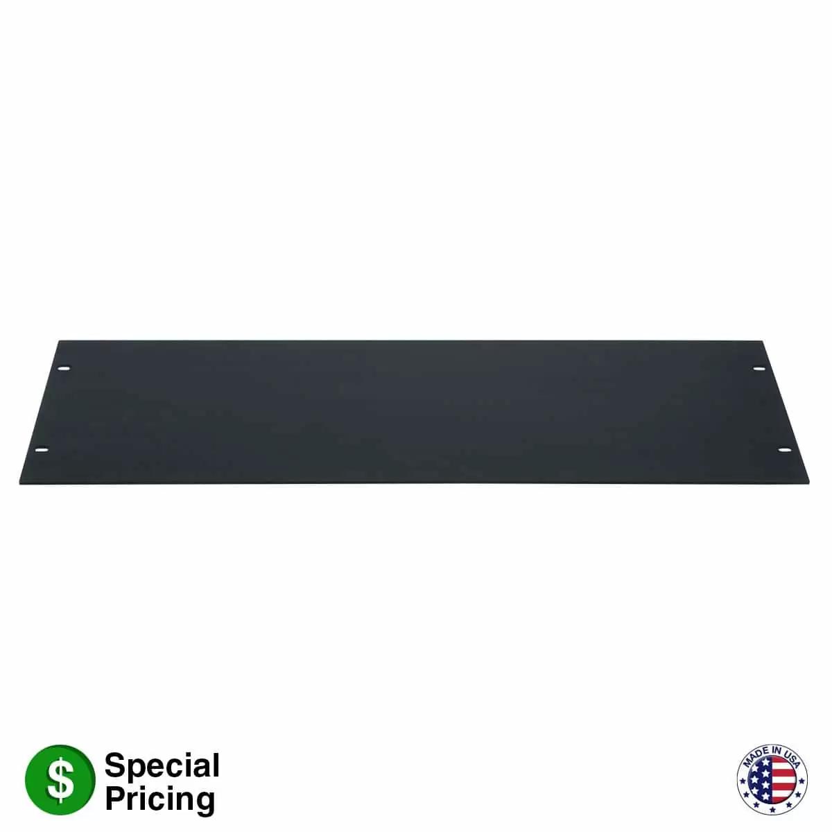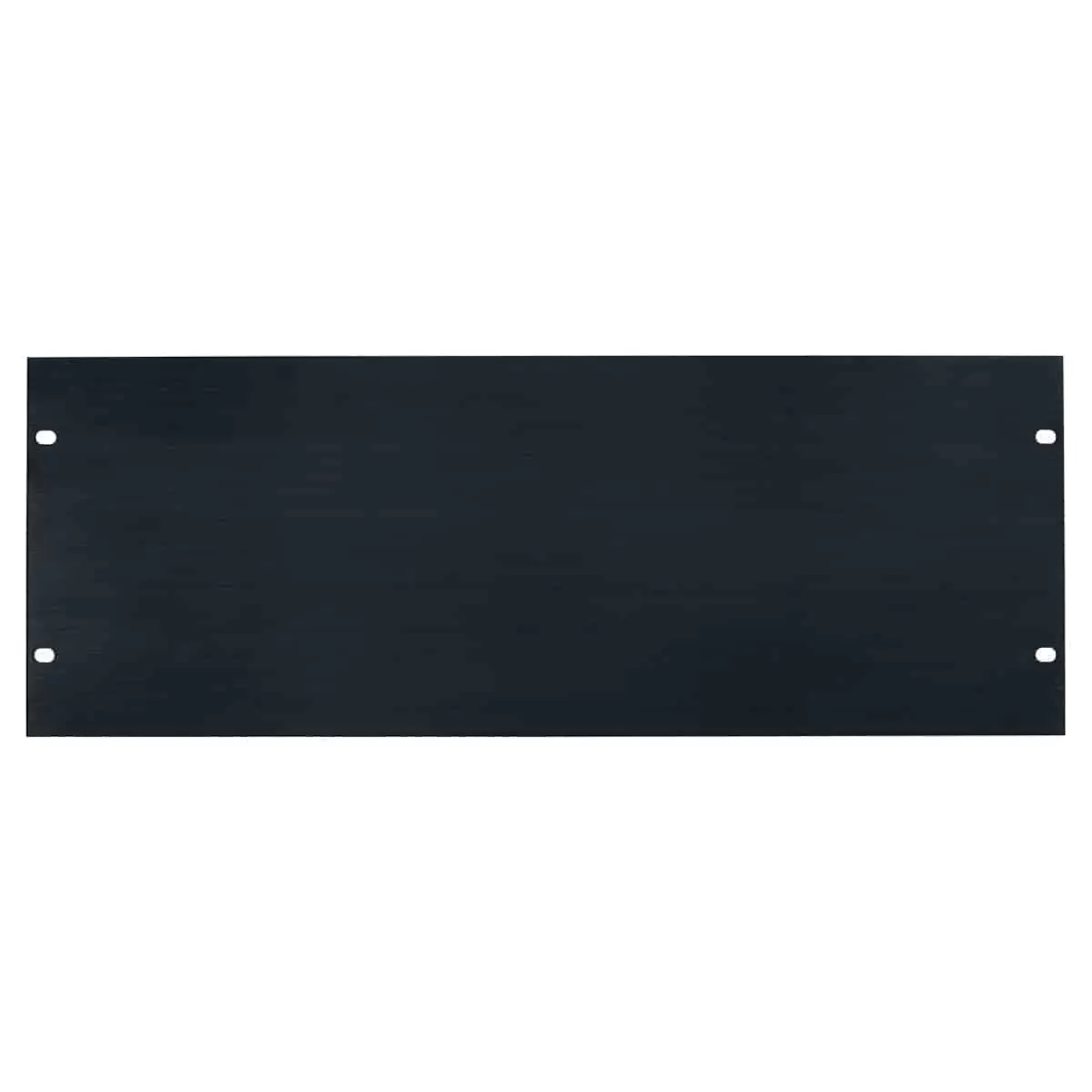 Aluminum blanking panels with flat edges are made for 19-inch E.I.A. racks. The panels feature a brushed black anodized finish to better match some mounted electronics. Heights available from 1 to 4 rack units. Single pack carton.