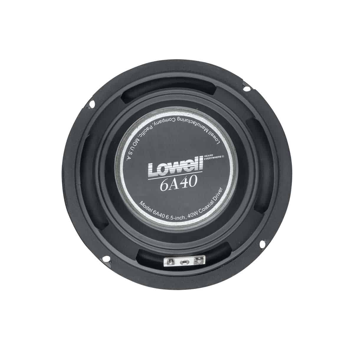 The driver shall be Lowell Model No. 6A40 which shall be of the coaxial type having electrically independent high and low frequency transducers. The low frequency section shall have a 6.5 inch diameter polypropylene cone and the high frequency section shall have a tweeter with a 1” balanced-drive dome. A built-in electrical crossover network shall be employed to accomplish the proper frequency division between the two drivers. The crossover frequency shall be at 4000Hz with a first order high-pass filter. The driver shall be capable of producing a uniform audible frequency response over the range of 40Hz-20kHz+6dB with a dispersion angle of 120 degrees conical @2000Hz-6dB. The average sensitivity shall measure 85dB (SPL at 1W/1M). Rated power handling shall be 40 watts RMS. The low frequency voice coil shall have a diameter of 1 inch and shall operate in a magnetic field derived from a ferrite (ceramic) magnet having a nominal weight of 10 oz. The high frequency voice coil shall have a diameter of 0.53 inches and operate in a magnetic field derived from a ferrite (ceramic) magnet having a nominal weight of 2 oz. The voice coil impedance shall be 8 ohms. The driver shall have a round, structurally reinforced stamped 20 ga. steel frame to maintain precise mechanical alignment and shall provide facilities for mounting a transformer. The driver shall have an overall diameter of 6.5 in. with eight obround holes equally spaced at 45 degrees on a 6.13 in. diameter mounting bolt circle. The mounting depth shall not exceed 3 in. (not including optional transformer). External metal parts shall be finished in black enamel paint or zinc plating to resist rust and corrosion.