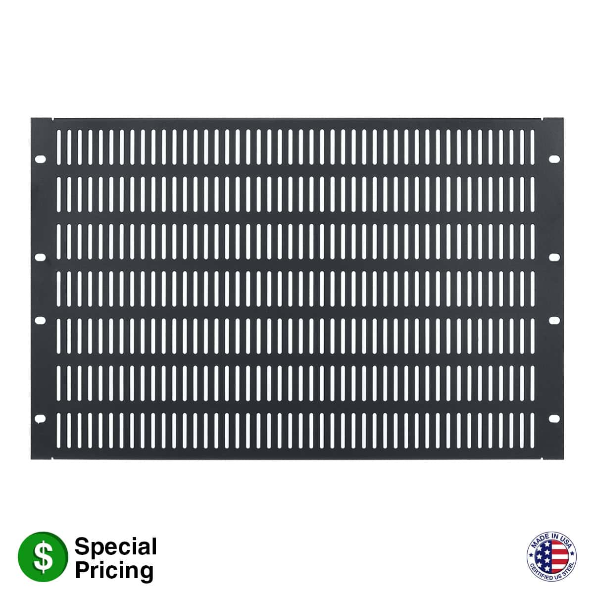 Nineteen inch steel vent panels with smooth-black powder-coat finish feature slots for passive ventilation.