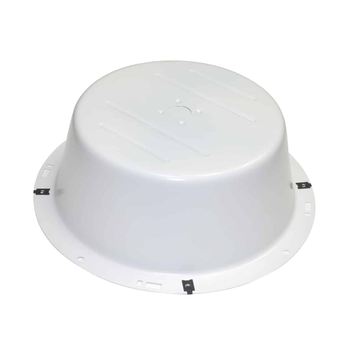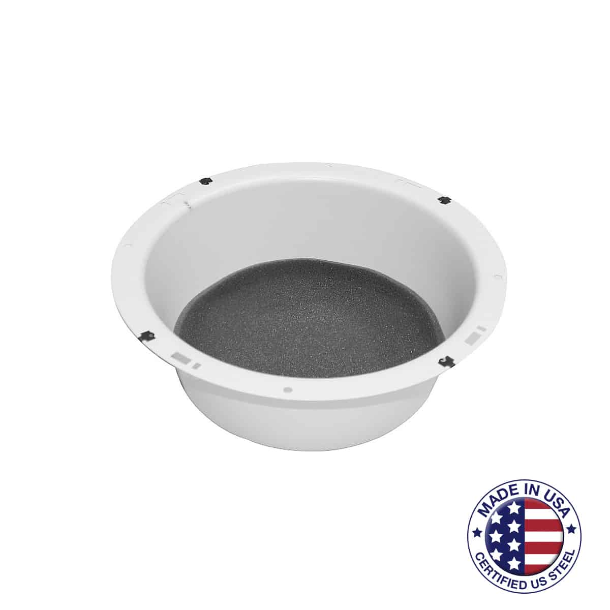 The enclosure for recessed installation of an 8-inch speaker shall be Lowell model 8XD4-P. It shall have a tapered 10-inch can diameter and 4-inch depth. It shall include a polyurethane foam disc. The enclosure shall feature one planished knockout (1/2-inch) on top. The enclosure shall be manufactured in the USA using USA-certified steel and have a white powder-coat finish. It shall be Trade Agreement Act (TAA) compliant and Buy American Act (BAA) compliant.