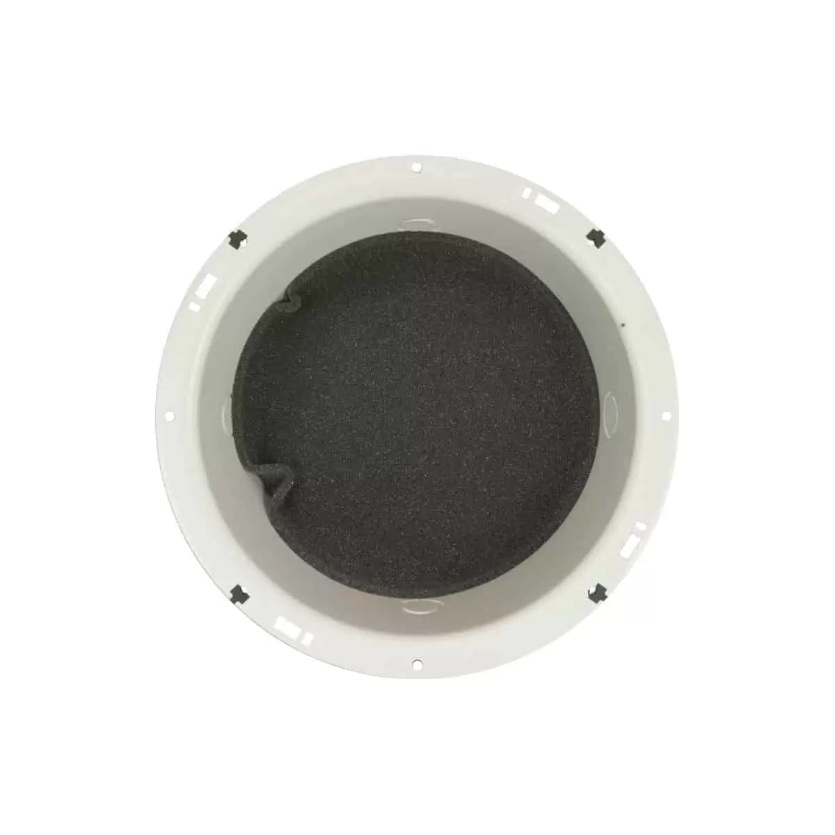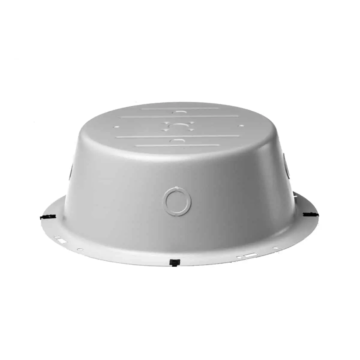 The steel enclosure for recessed installation of an 8″ speaker shall be Lowell model 8XD4. It shall have a tapered 10″ can diameter and 4″ depth. It shall include a polyurethane foam disc. The enclosure shall feature one knockout (1/2″) on top and four combination knockouts (1/2″–3/4″) on sides spaced at 90-degree intervals. The enclosure shall be manufactured in the USA using USA-certified steel and have a white powder-coat finish. It shall be Trade Agreement Act (TAA) compliant and Buy American Act (BAA) compliant.