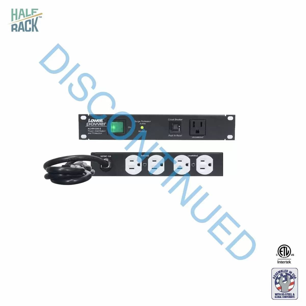 The AC rackmount power panel shall be Lowell Model No. ACHR- 1505-S. It shall be ETL Listed and have a power rating of 120VAC, 60Hz, 15A with five outlets. Activation shall be via a lighted rocker switch which shall control two rear outlets. The front outlet and two rear outlets shall be unswitched. Termination shall be via a 6 ft. cord with NEMA 5-15P plug. The steel chassis shall measure 1U x 10.375″W x 7.25″D and shall have a black powder epoxy finish. The unit shall also include surge protection to 30,000A which shall have an LED status indicator.