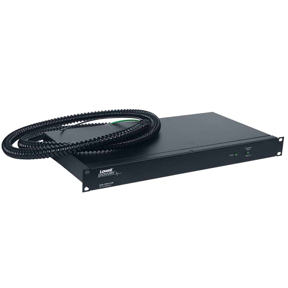 Hardwired PDU model ACR-1508-SHW features eight (8) NEMA 5-15R receptacles, all located in the rear. The 120VAC 60Hz 15A panel includes basic surge protection (surges up to 30,000A). Front LEDs provide status of power and surge protection. Power input is via a 6-ft. non-metallic flexible whip, which can be trimmed in the field as needed.
