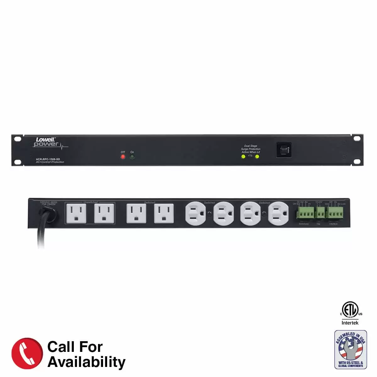 This power distribution unit (PDU) is a 19-inch rack-mount panel that features remote control circuitry, surge protection, and eight NEMA 5-15R receptacles. Six outlets are to be controlled by a remote switch, external trigger voltage, alarm system, or sequencer (ordered separately). Two outlets are always on. All outlets are clearly marked to assist the integrator with connections. The panel also includes includes basic surge suppression (maximum surge current 40,000A).