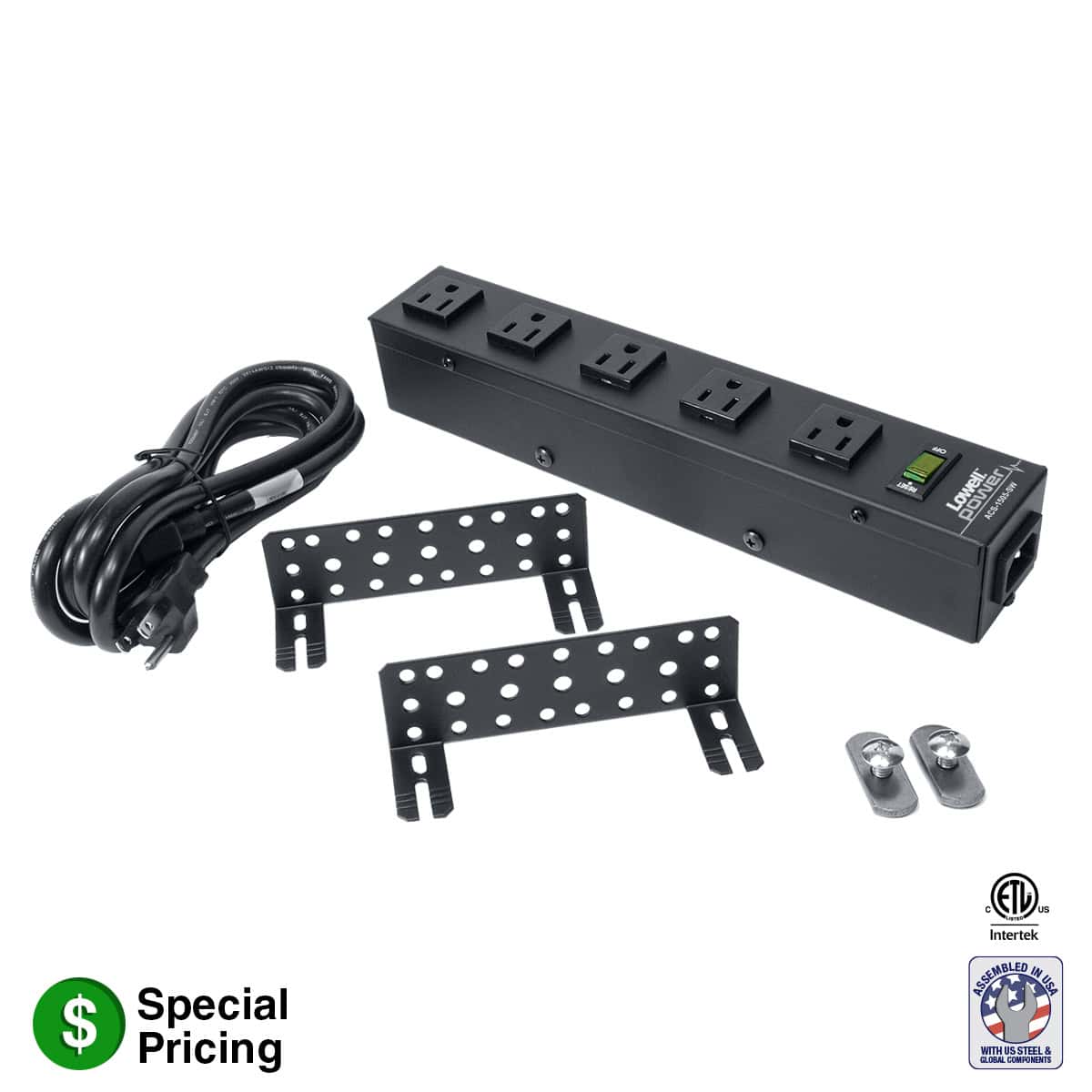 Compact 12-inch power strip with five NEMA 5-15R receptacles controlled by a lighted on/off rocker switch. Receptacle spacing will accommodate some power supplies (installer should check equipment requirements). Detachable 6-ft. IEC cord with NEMA 5-15P plug. Universal mounting brackets allow the strip to be installed with receptacles facing front, center or rear. Includes hardware to mount to rack, shelf, or under desk/counter.