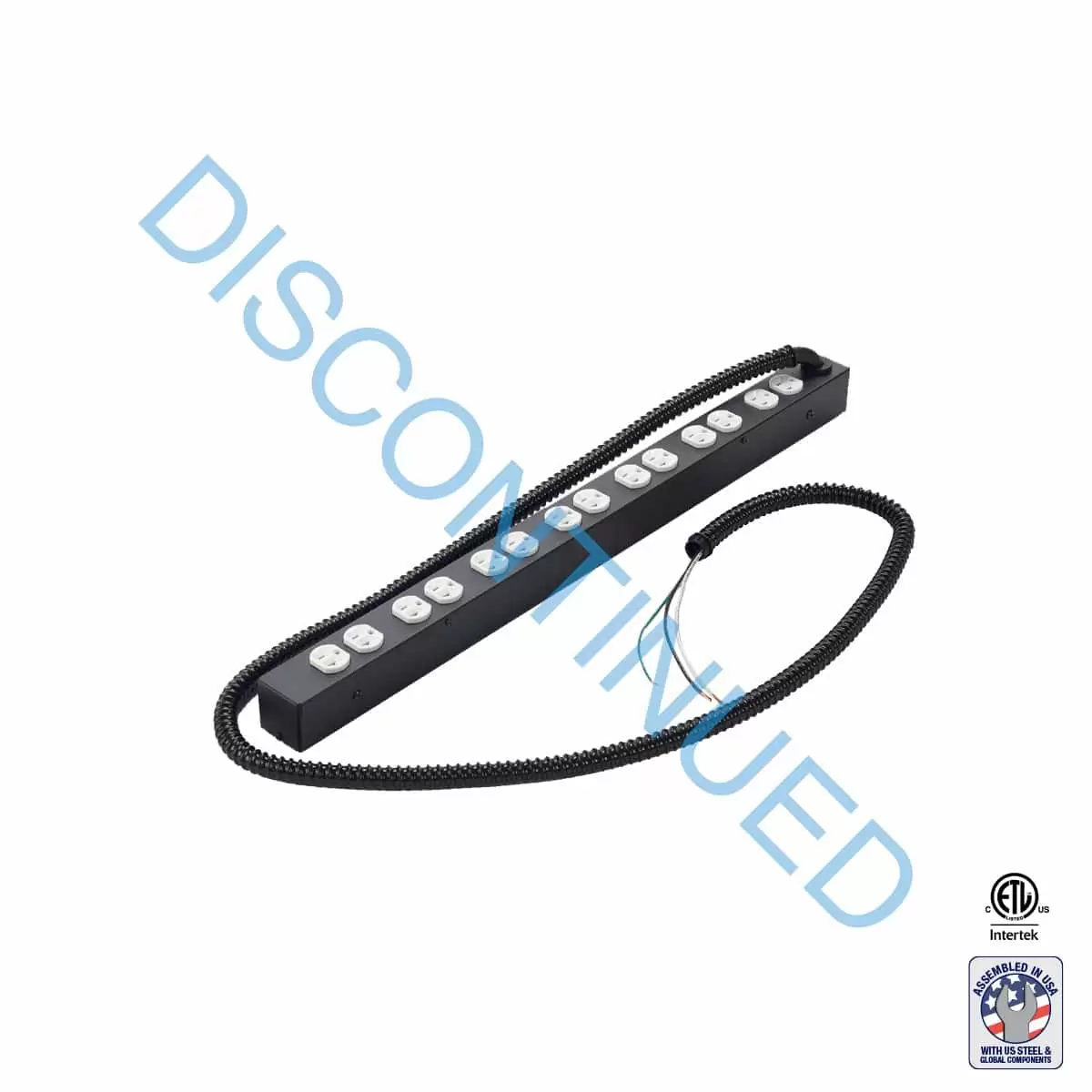 Hardwired 120VAC 60Hz 20A power strip features 14 NEMA 5-20R receptacles (7 duplex). The 30-inch chassis terminates via a 6-ft. non-metallic flexible whip with pigtail leads. The whip rotates in any direction and can be trimmed in the field if needed. Includes universal mounting brackets for rack, wall or counter installation.