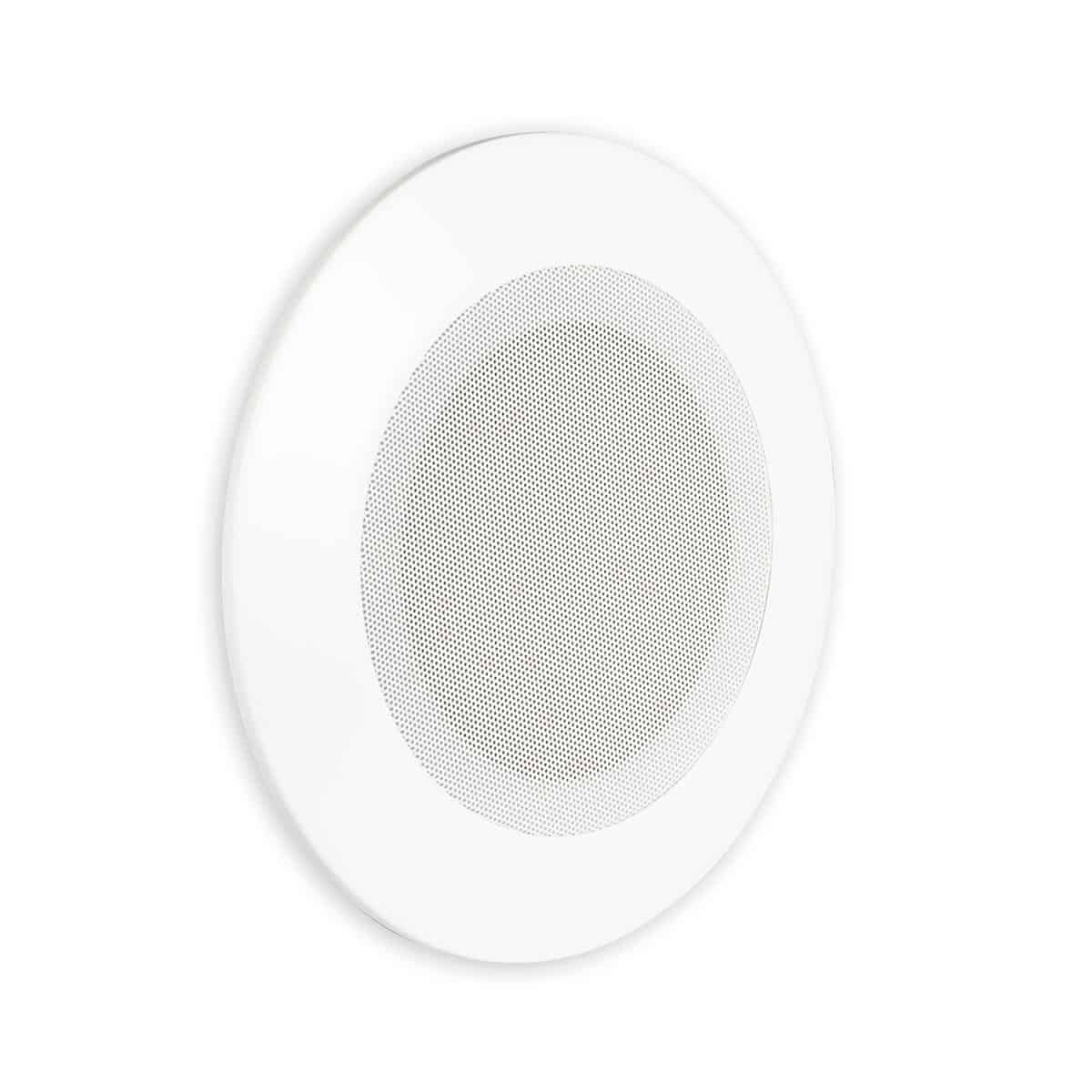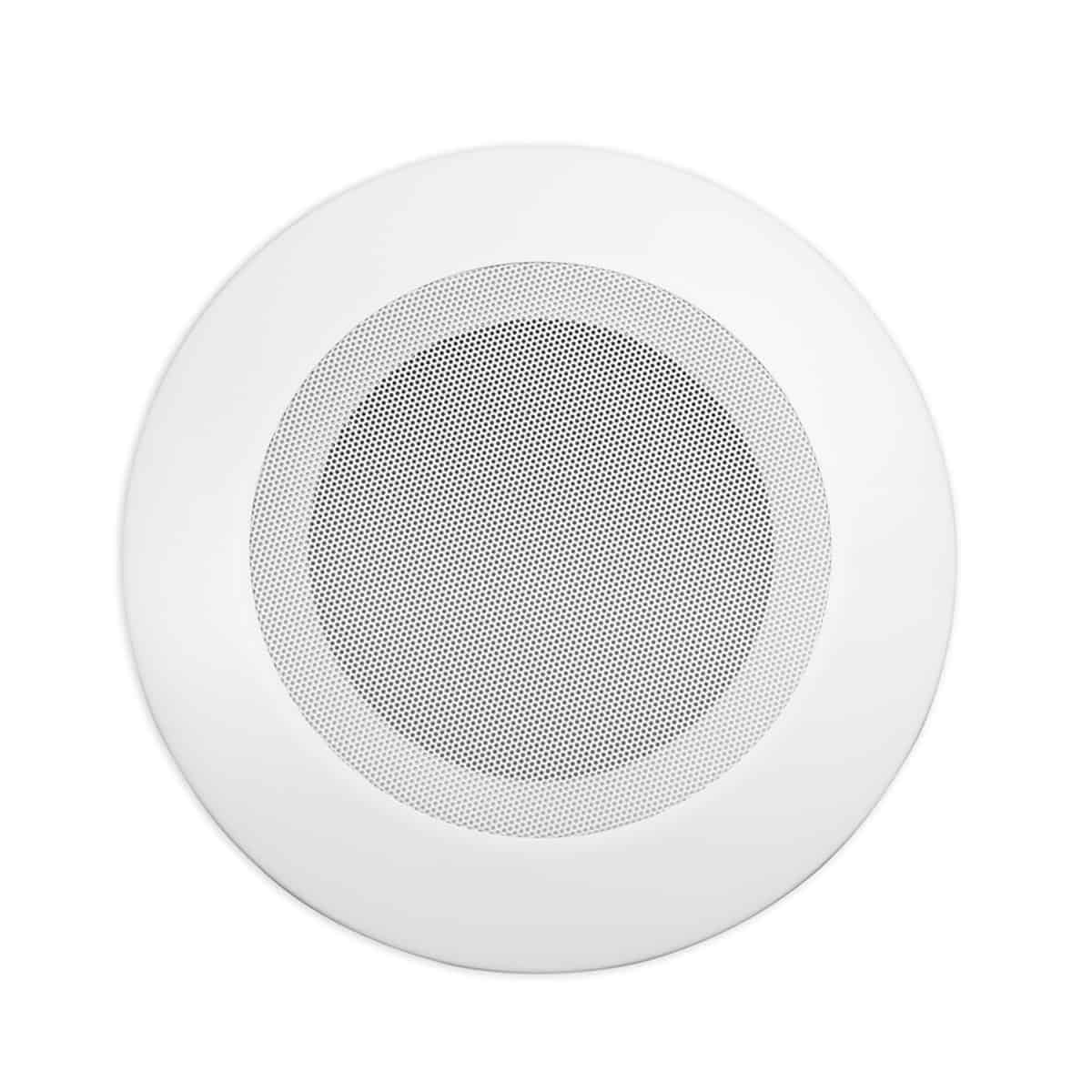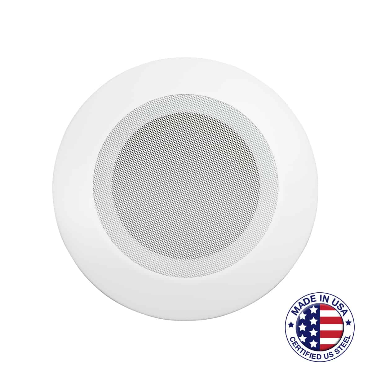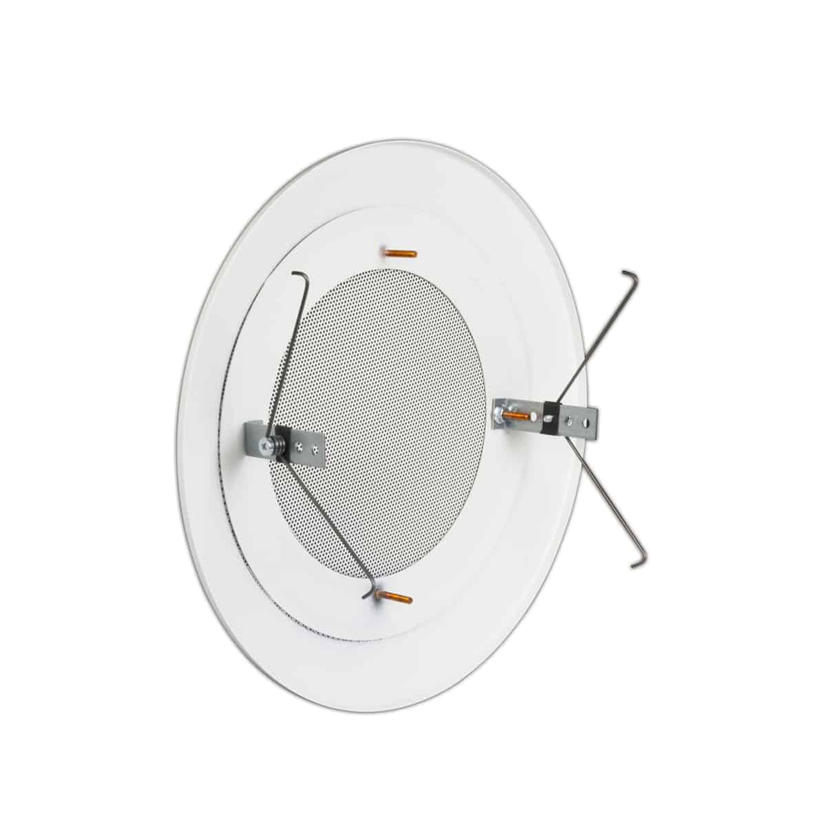 The contoured steel torsion grille for 8 inch drivers shall be Lowell Model CN-8M. It shall be fabricated from 20-gauge steel with a welded steel mesh center and mount using torsion bracket/spring devices. The grille diameter shall be 12.5 in. with a shallow mounting projection of .754 in. It shall be finished in white powder epoxy and include welded studs, serrated hex nuts, two torsion bracket/spring devices and installation accessories to mount to specified Lowell backbox or mounting ring with torsion receptacles. The torsion/bracket method shall be adjustable for varied ceiling depths.