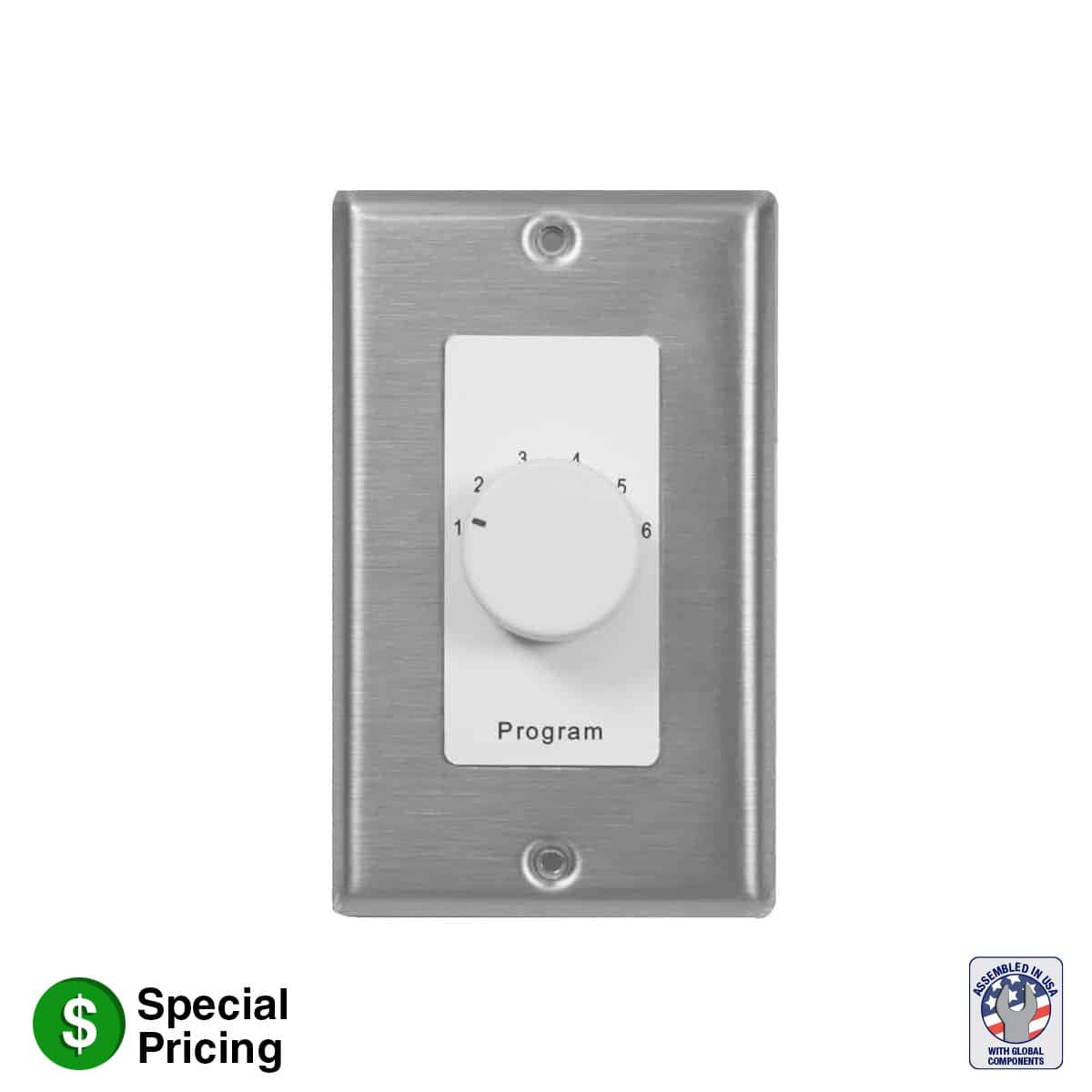 The source selection device shall be Lowell Model No. CS6-DSW which shall be a six input selector switch in a 1-gang decorator style wall plate finished in stainless steel and white. It shall include a rotary knob and mounting screws. The selector switch shall be two-pole rotary style for isolation between lines. Wiring connections shall be to screw terminals allowing the unit to be field connected as an independent selector for use with a volume control. The wall plate shall measure 2.75 in. x 4.5 in. x 1 in. for installation into a standard gang size E.O. box (not included).