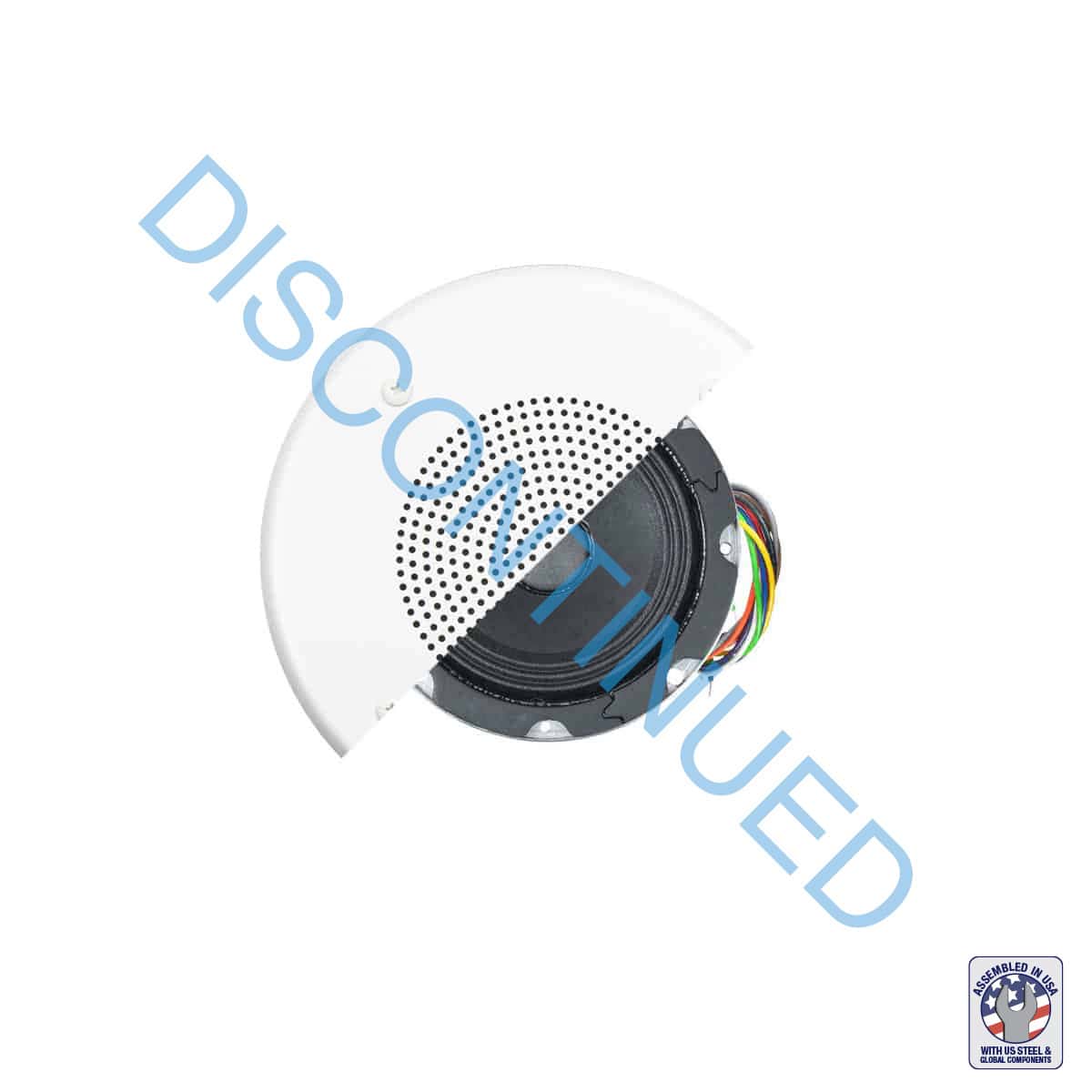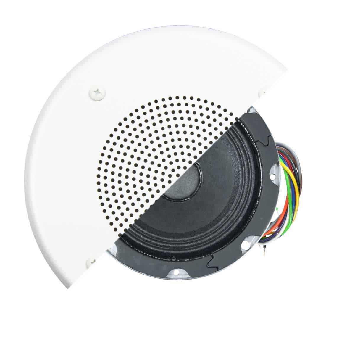 The 4-inch speaker assembly shall be Lowell Model No. D1410-72 which shall include a 4 in. high-compliance driver with wired transformer and screw-mounted grille. The driver shall have a 15 watt RMS power rating and employ a 10 oz. ceramic magnet and paper cone with treated cloth surround. Frequency response shall be 67Hz–16kHz (±6dB) and 57Hz–20kHz (±7.4dB) with an average sensitivity of 90.8dB measured 1W/1M. The transformer shall be a factory-wired 70/25V unit with primary taps at 0.25, 0.5, 1, 2 and 5W. The 7.25 in. diameter steel grille shall be screw-mounted to the driver and have a white powder epoxy finish.
