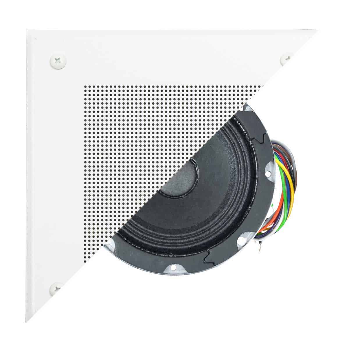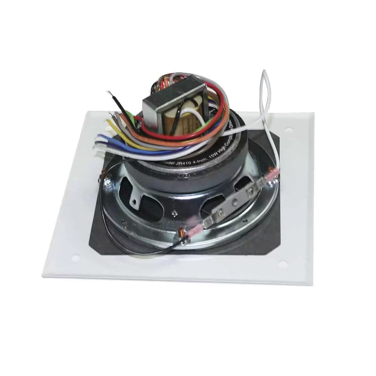 Speaker assembly D6410-72 with full fidelity sound and very wide dispersion includes a 4-inch 15W high compliance driver, dual voltage (25V/70V) 5W transformer and a square steel grille with white powder epoxy finish. The speaker assembly provides clear intelligibility and very wide dispersion with minimal architectural visibility. Order enclosure separately.