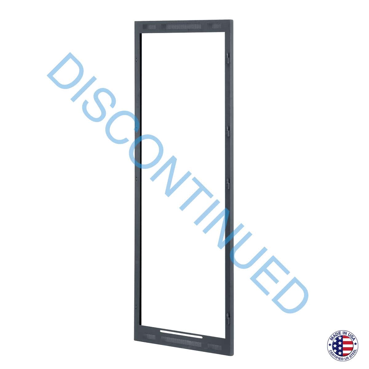 The rack shall be equipped with dual-door frame model LFFD-44, which will accept 1 or 2 short surface-mount front doors to separate and/or secure access to mounted equipment. The surface-mount steel frame shall extend 1″ from the rack. It shall attach to factory-installed threaded inserts on the rack, without drilling. Inserts shall be located on right and left to accommodate mounting on either side. The dual-door frame shall be steel with black powder epoxy paint. The doors and an alternate key lock, if needed, shall be ordered separately.