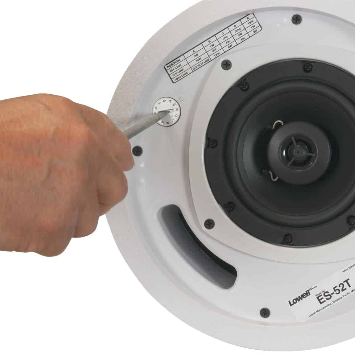 Model ES-52T produces excellent intelligibility for speech and full-frequency response for music making it ideal for retail, commercial, industrial, institutional, and residential applications. This self-contained in-ceiling or in-wall speaker system with 5-1/4 inch coaxial driver has a high-frequency Mylar tweeter with acoustic lens to provide the kind of crisp, high-frequency response expected from high quality coaxial speakers. The ported enclosure is tuned for extended low-frequency response, while the speaker’s wide dispersion can actually reduce the number of speakers required to produce even coverage in distributed speaker systems.