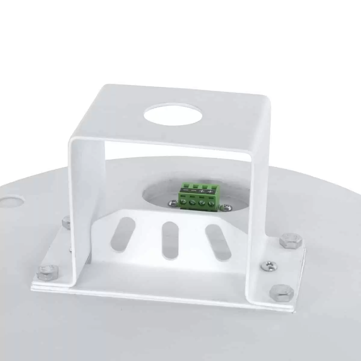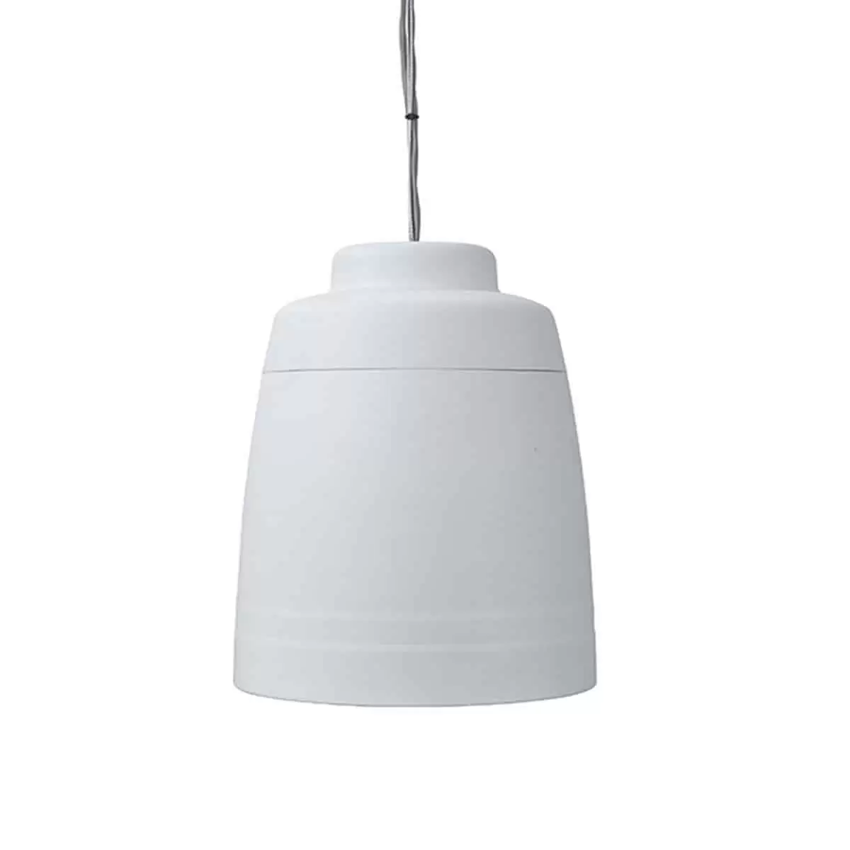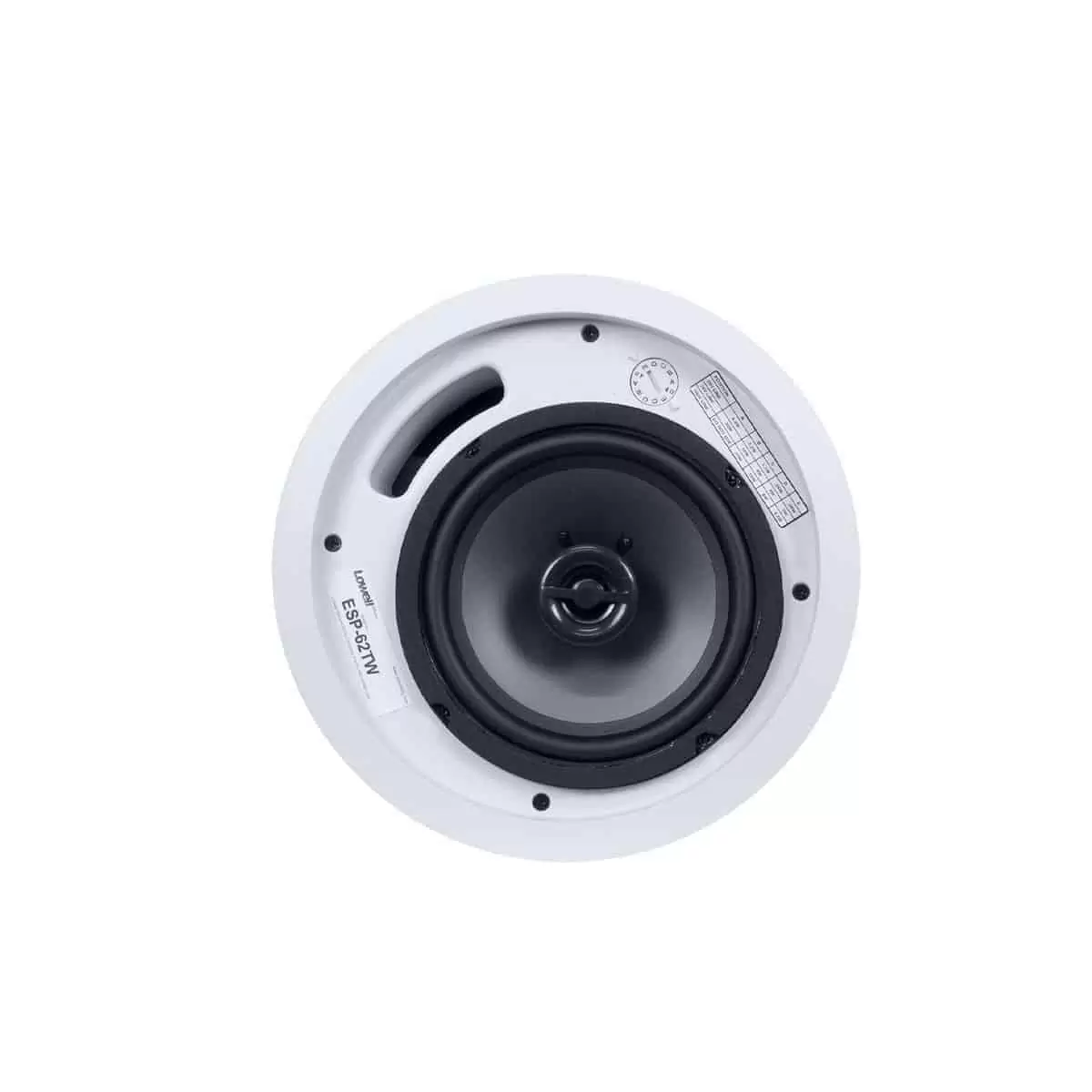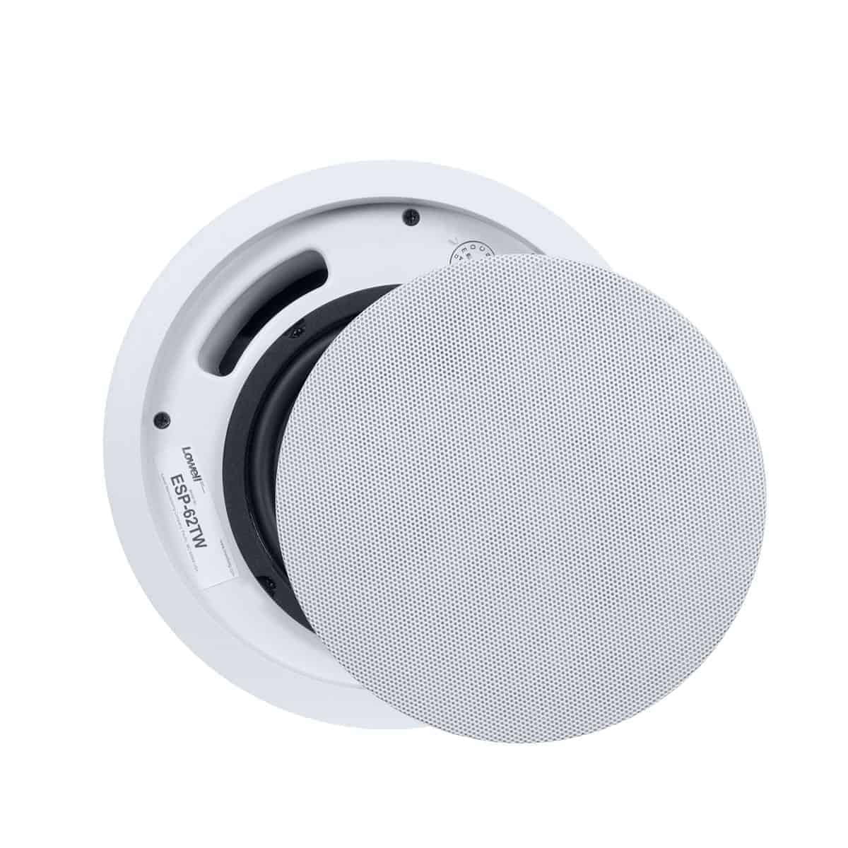 The loudspeaker shall be Lowell ESP-62TW, which shall include a high-performance 6-1/2″ coaxial driver, ported bass reflex enclosure and press-fit grille for pendant or U-bracket installation. Frequency response shall be 64Hz-20kHz ±6dB. Sensitivity for the system shall be 88.6dB log average @1W/1M over the frequency response range, measured in full-space. The speaker shall be constructed of a polypro- pylene cone with rubber surround and a PEI tweeter. The woofer magnet weight shall be a minimum of 15.45 oz. (438.1g) and the woofer voice coil diameter shall be 1″ (25.47mm). The transformer shall have primary taps for 100V (32, 16, 8, 4.2 watt); 70V (32, 16, 8, 4, 2 watt); and 25V (4.4, 2.2, 1.1, .55, .28 watt) with a selector switch mounted on the front under the grille that will include a 4 ohm transformer bypass position. The enclosure shall be white ABS plastic featuring a main body, magnetic cover, and bottom baffle where the driver shall be mounted. The enclosure shall feature a bracket assembly to accommodate cable or pipe hanging installations (cable/pipe not included). A four-conductor Phoenix style removable connector shall be located under the magnetic cover to allow input wiring and parallel output wiring to the next speaker. The unit shall include a fine mesh 20-gauge CRS press-fit grille with UV rated powder coating (white), scrim and pull tool.