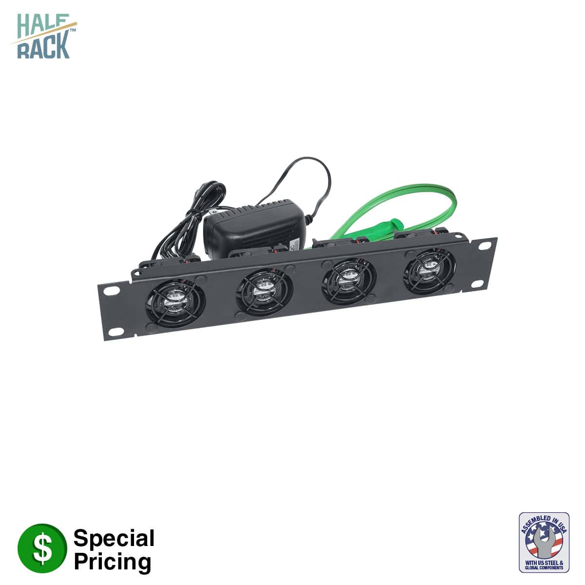The fan panel for a half rack shall be Lowell Model FDC4-1HRT. Housing shall measure 1.75 (1U) x 10.375 x 1.625 inches [45 x 264 x 41mm] and have a black powder epoxy finish. The panel shall include four fans, each with a 1.57 in. [40mm] diameter. Total airflow rating is 36cfm; total noise rating is 38dB. The unit shall include a UL Listed power supply with four plug adaptors—NEMA 1-15 for North America, Schuko CEE 7/16 for central Europe, BS1362 for the U.K. and AS3112 for Australia/New Zealand. It shall require 9.6 watts of power.