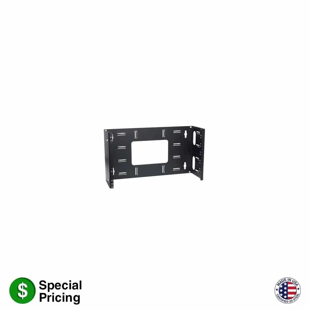 The hinged utility wall-mount bracket for shallow 19 in. EIA compliant equipment shall be Lowell Model No. HUB-6. It shall be 16-gauge U.S. steel construction with 11-gauge rails tapped 10-32 on EIA spacing. Finish shall be black semi-gloss. The unit shall measure 19.17 in. x 6 in. x 10.5 in. (6U) and feature holes on standard 16 in. centers and EIA spacing to enable mounting to a wall or to a 19 in. open frame rack. It shall have a hinged design to allow it to swing left or right 180 degrees depending on how it’s mounted. The unit shall include built-in cable tie-down lances, access holes for cable management, rack screws and velcro straps.