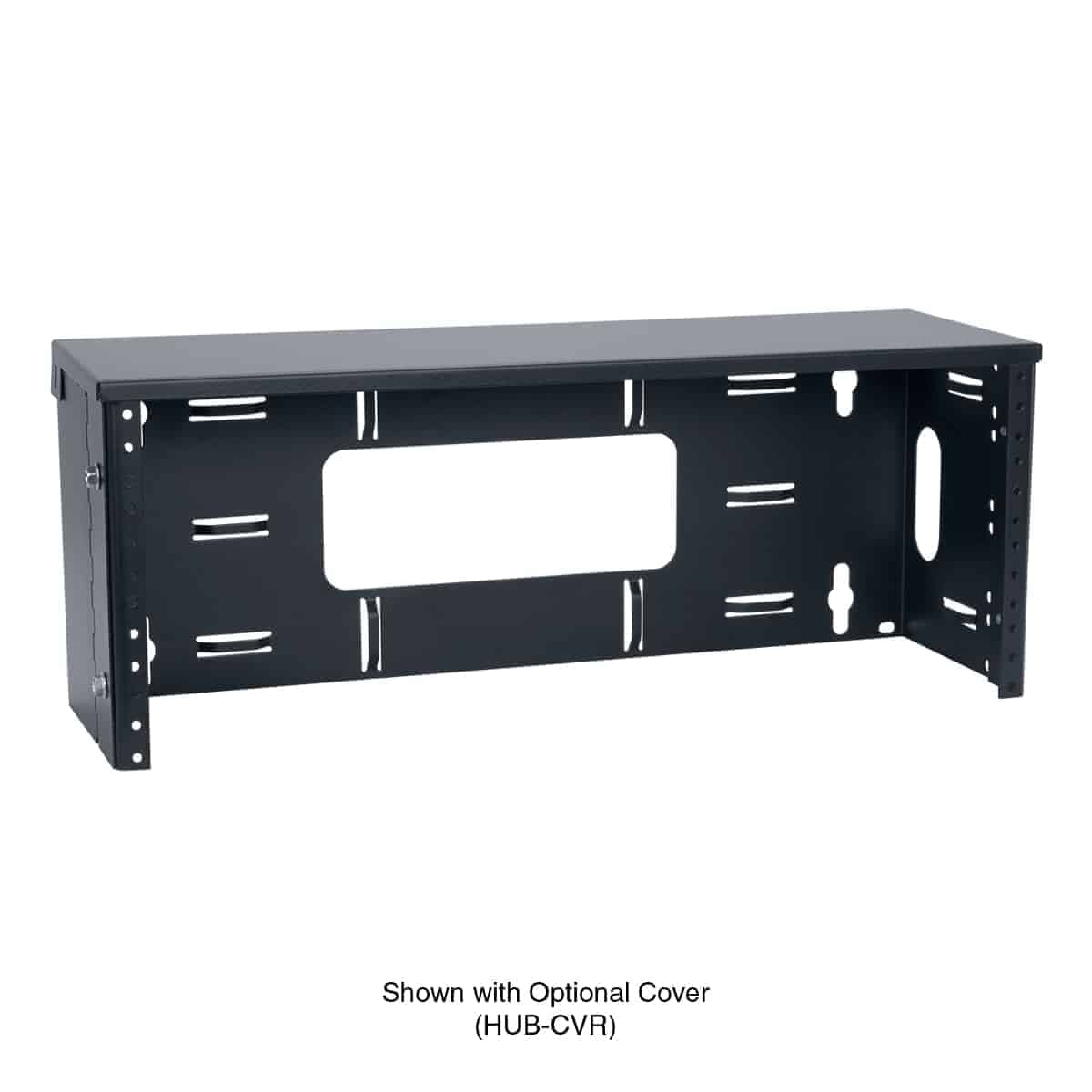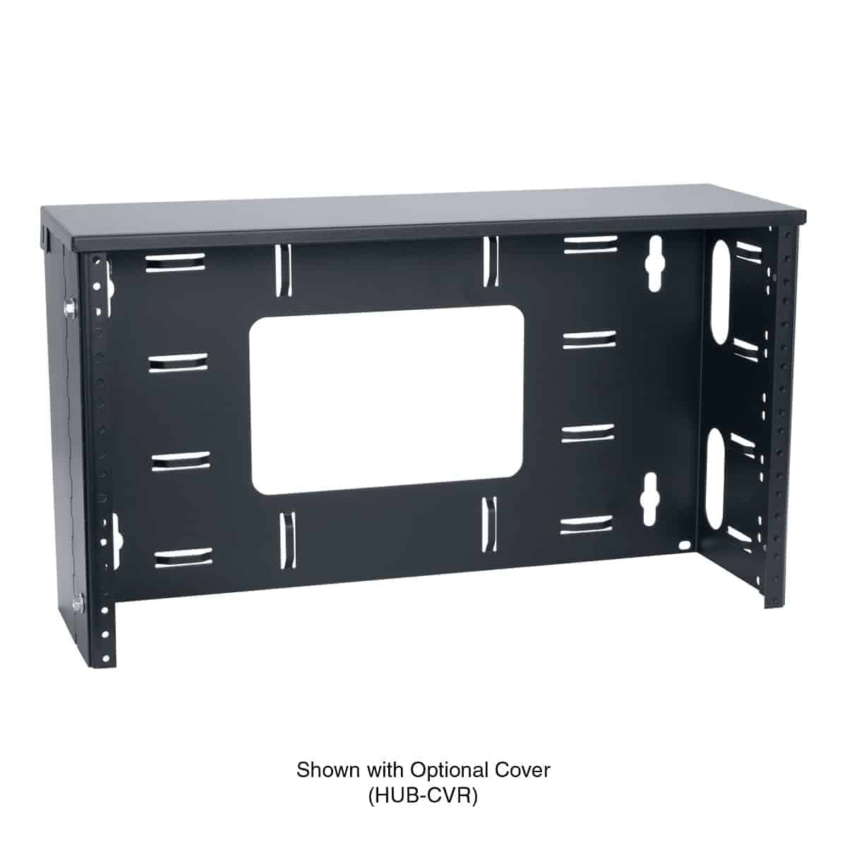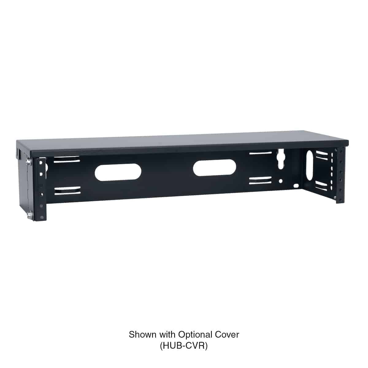 Steel top cover for use with the HUB Series wall-mount utility brackets can help protect cables. It also serves as a convenient shelf above mounted equipment.
