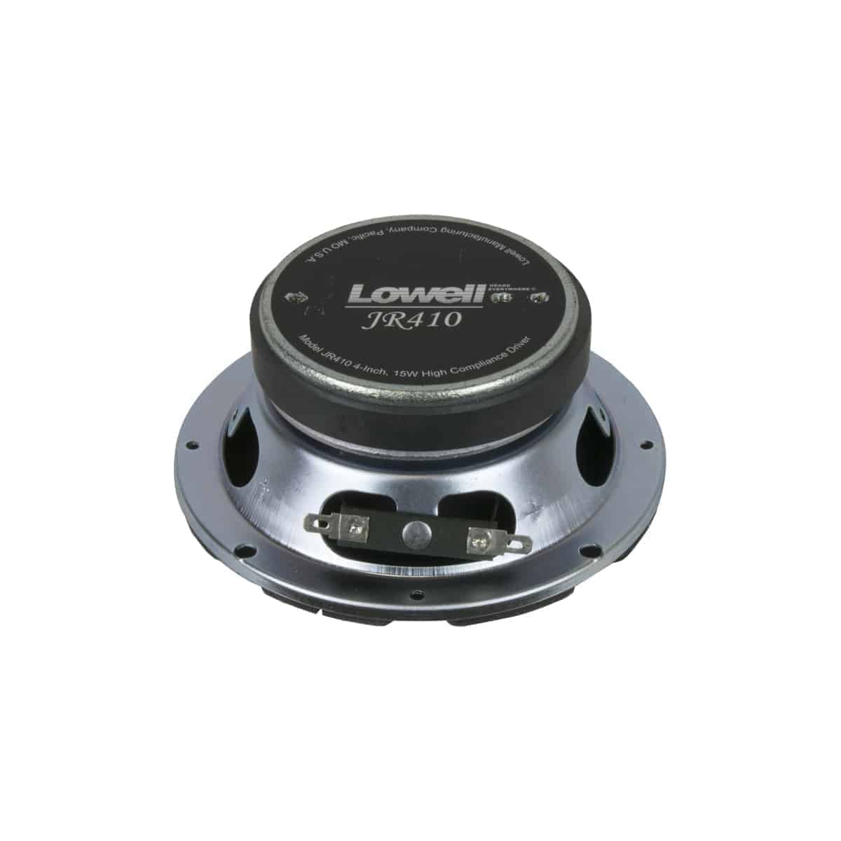 The high compliance 4 inch driver shall be Lowell Model JR410. It shall be of the permanent magnet type having a paper cone with a treated cloth surround. It shall be capable of producing a uniform audible frequency response over the range of 67Hz-16kHz (±6dB) and 53Hz–20kHz (±8dB) with a dispersion angle of 170 degrees conical @2000Hz (–6dB). Average sensitivity shall measure 90.8dB (SPL at 1W/1M). Rated power rating shall be 15 watts RMS. The voice coil shall have a 1 in. diameter and shall operate in a magnetic field derived from a strontium ferrite (ceramic) magnet with 10 oz. nominal weight. Voice coil impedance shall be 8 ohms. The driver shall have a structurally reinforced stamped 20-gauge steel frame to maintain precise mechanical alignment and shall provide facilities for mounting a transformer. The driver shall have an overall diameter of 5.00 in. with four round holes equally spaced at 90 degrees on 4.72 in. diameter mounting bolt circle. Driver depth shall be 2.12 in. External metal parts shall be zinc-plated to resist rust and corrosion.
