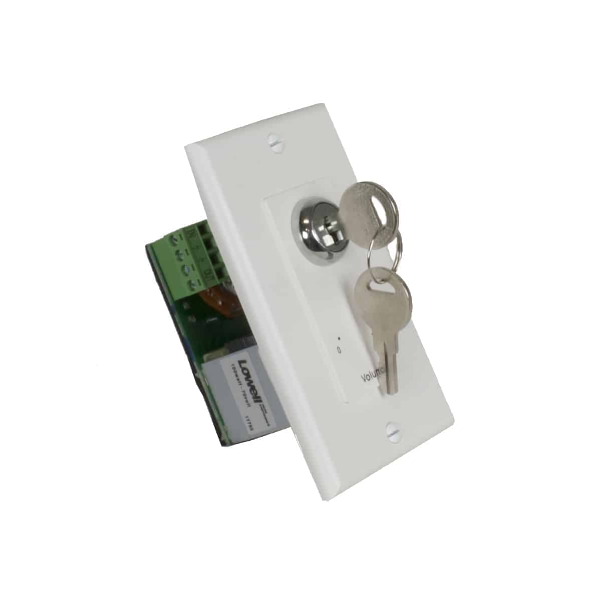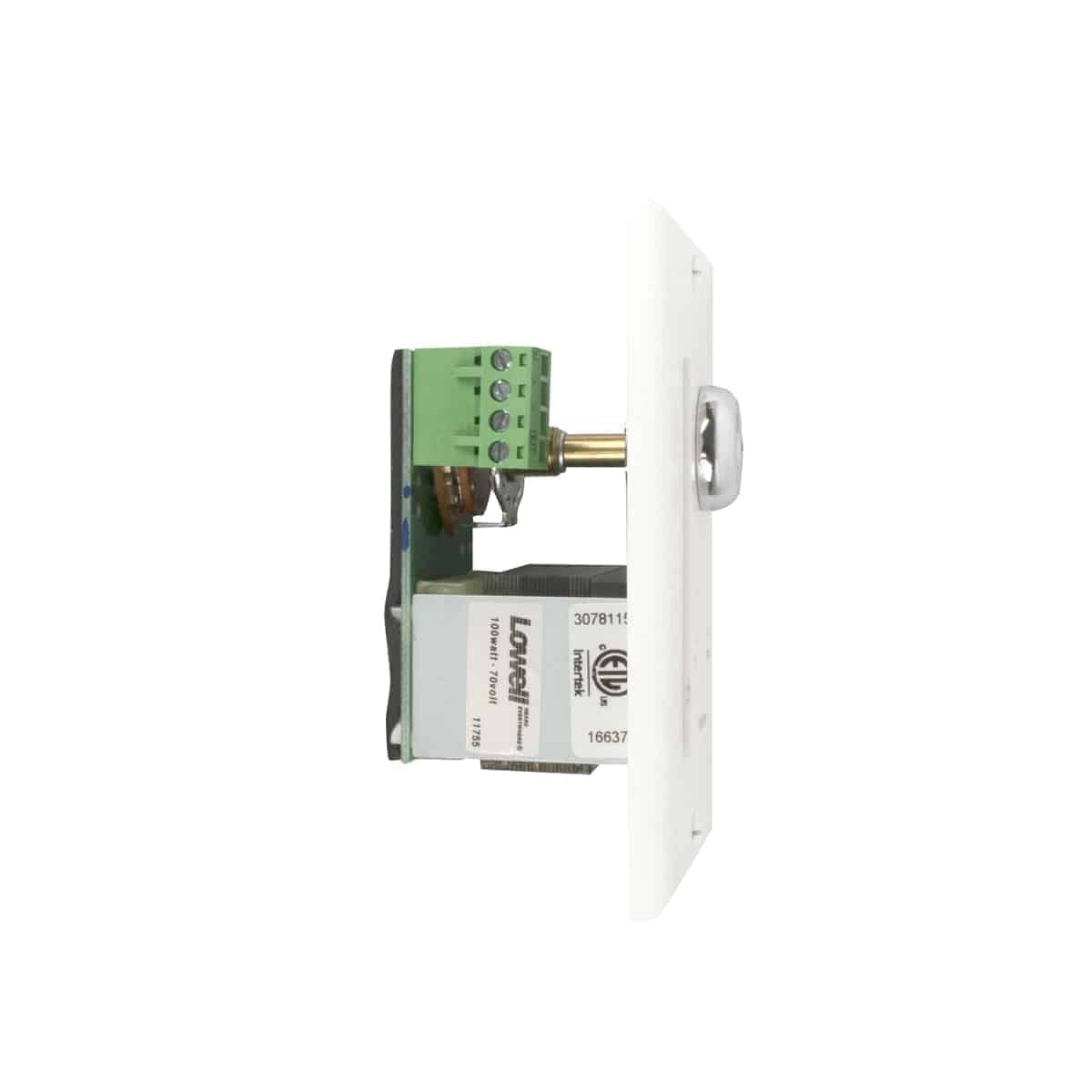 The ETL Listed (UL60065, UL2043) volume control shall be Lowell Model KL100-DW with 100W power rating, 3dB per step attenuation, and switch positions 10-off. It shall feature phoenix-style plug-in screw termination strips for pre-wire with capacity up to 14-gauge. It shall include a one-gang decora-style wall plate with white finish. Volume adjustment shall be controlled by a key. The unit shall be Assembled in USA with global components. The control shall be ETL Listed and Trade Agreement Act (TAA) compliant.