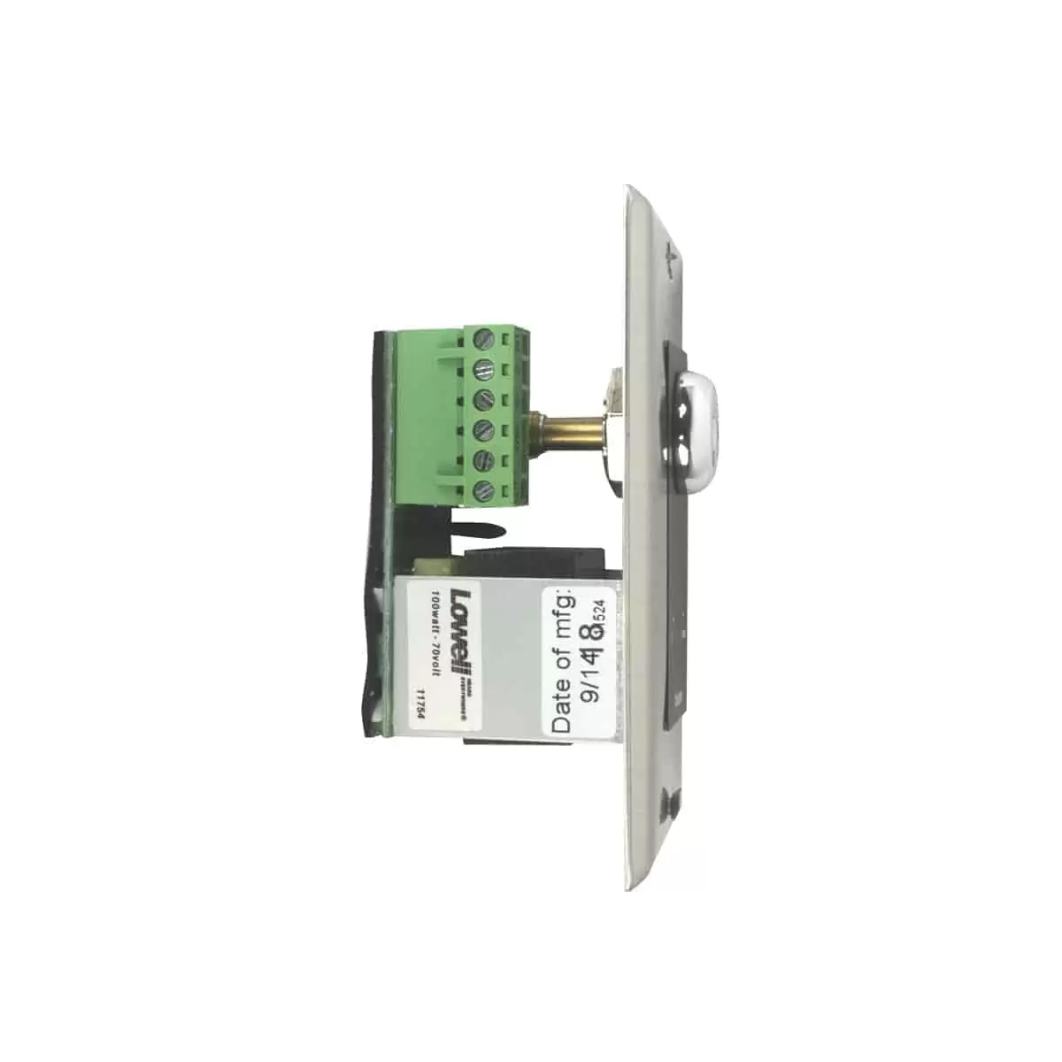 The ETL Listed (UL60065, UL2043) volume control shall be Lowell Model No. KL100-PA-DSB with 100W power rating, 3dB per step attenuation, switch positions 10-Off, and a priority relay (24VDC @5mA). It shall feature Phoenix style plug-in screw termination strips for pre-wire with capacity up to 14-gauge. It shall include a one-gang decorator style wall plate in stainless steel & black. Volume adjustment shall be controlled by a key.
