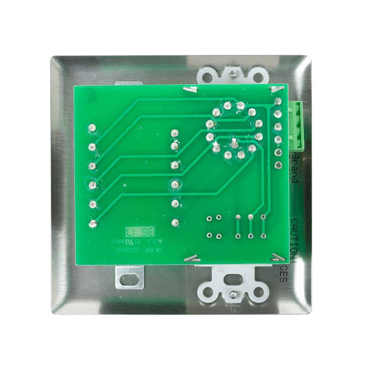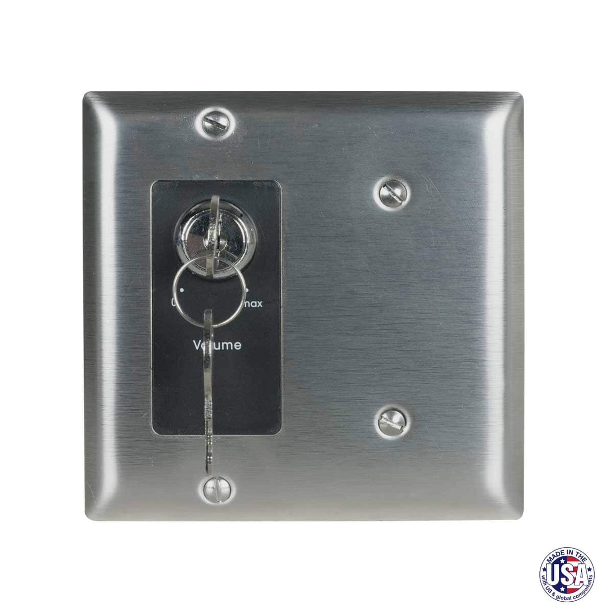 The ETL Listed (UL60065, UL2043) volume control shall be Lowell Model KL200-DSB with 200W power rating, 3dB per step attenuation (6dB per step in last two positions before off), and switch positions 10-off. It shall feature phoenix-style plug-in screw termination strips for pre-wire with up to 14-gauge wire capacity. It shall include a two-gang decora-style wall plate (stainless steel with black subplate). Volume adjustment shall be controlled by a key. It shall be Made in USA with US and global components. The mono attenuator shall be ETL Listed and Trade Agreement Act (TAA) compliant.