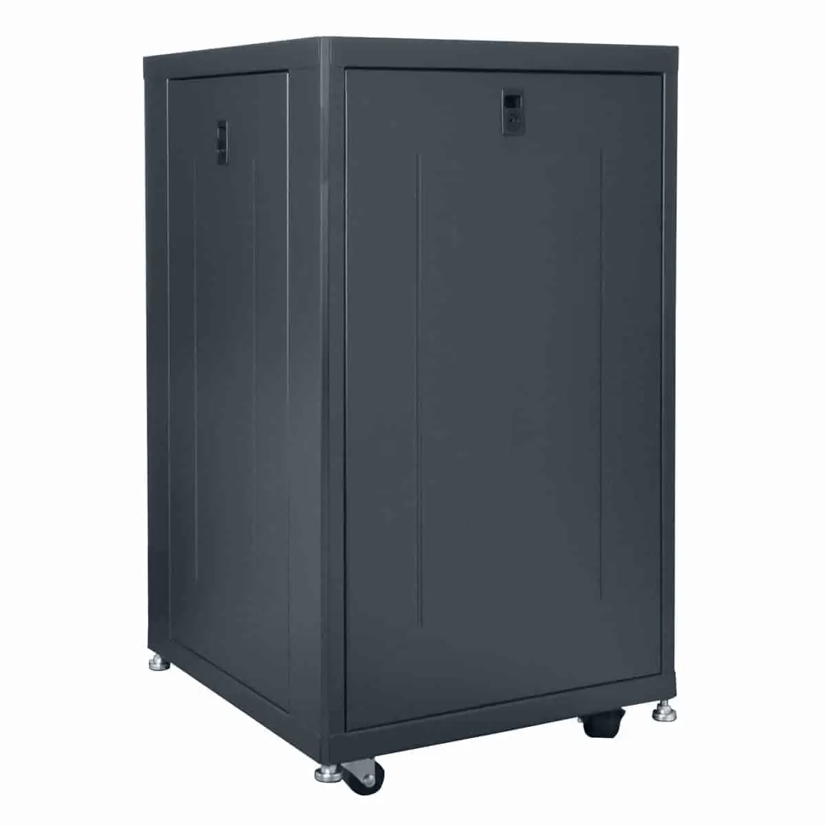 The EIA/TIA-compliant 19-inch equipment rack shall be Lowell Model LCDR-1824 which shall measure 22.31″W x 24.00″D x 38.43″H (with casters). The rack shall have 18U panel space and 500 lbs. load capacity. Construction shall be fully-welded 16-gauge steel with 16-gauge top/base reinforced at load-bearing junctions and finished with a charcoal grey textured powder coating. It shall include a tempered glass front door with key lock, recessed rear access cover with key lock, removable side panels with locks, two pairs of 11-gauge steel rails with mounting holes tapped 10-32 and rack unit increments printed on EIA spacing, steel top with 2 vents and a hole with grommet for cable access, three (2U x 18″D) shelves with vents, and three (2U) blank panels. The base shall feature a center opening, 2 holes with grommets for rear cable access, a grounding stud, 4 casters (2 locking) and 4 leg levelers. The rack shall be manufactured in the USA using USA-certified steel. It shall be Trade Agreement Act (TAA) compliant and Buy American Act (BAA) compliant.
