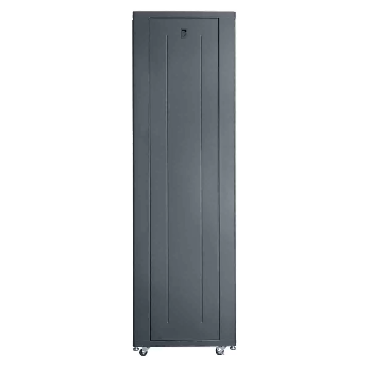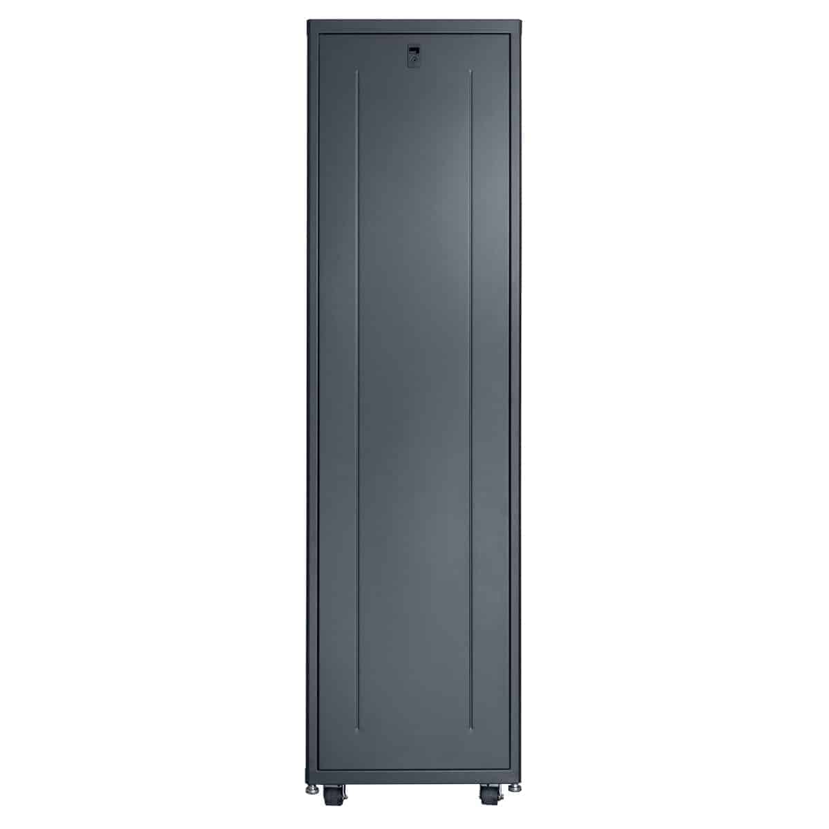 The EIA/TIA-compliant 19″ equipment rack shall be Lowell Model No. LCDR-4224 which shall measure 22.31″W x 24.00″D x 80.43″H (with casters). The rack shall have 42U panel space and 1200 lbs. load capacity. Construction shall be fully welded 16-gauge steel with 16-ga. top/base reinforced at load-bearing junctions and finished with a charcoal grey textured coating. It shall include a tempered glass front door with key lock, recessed rear access cover with key lock, removable side panels with locks, two pairs of 11-gauge steel rails with mounting holes tapped 10-32 and rack unit increments printed on EIA spacing, steel top with 2 vents and a hole with grommet for cable access, nine (2U x 18″D) shelves with vents, and nine (2U) blank panels. The base shall feature a center opening, 2 holes with grommets for rear cable access, a grounding stud, 4 casters (2 locking) and 4 leg levelers. The rack shall be manufactured in the USA using USA-certified steel and have a textured charcoal-grey powder-coat finish. It shall be Trade Agreement Act (TAA) compliant and Buy American Act (BAA) compliant.