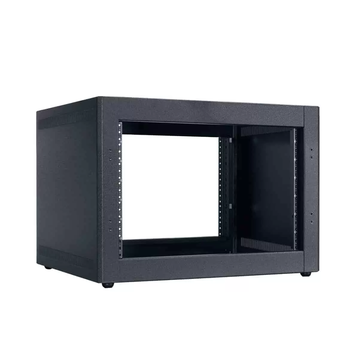 The EIA/TIA-compliant rack shall be Lowell Model LDTR-718 which shall measure 23.06″W x 18.18″D x 16.63″H (without rubber feet). It shall have a useable depth of 17.20″ and racking space of 7 rack units. The welded assembly shall be 16-gauge steel with fixed-position front and rear mounting rails tapped 10-32. The rack shall have a load capacity of 150 lbs. and shall include side vents and protective rubber feet. The top and bottom shall have knockouts for cable management. The rack shall be manufactured in the USA using USA-certified steel and have a black-textured powder-coat finish. It shall be Trade Agreement Act (TAA) compliant and Buy American Act (BAA) compliant.