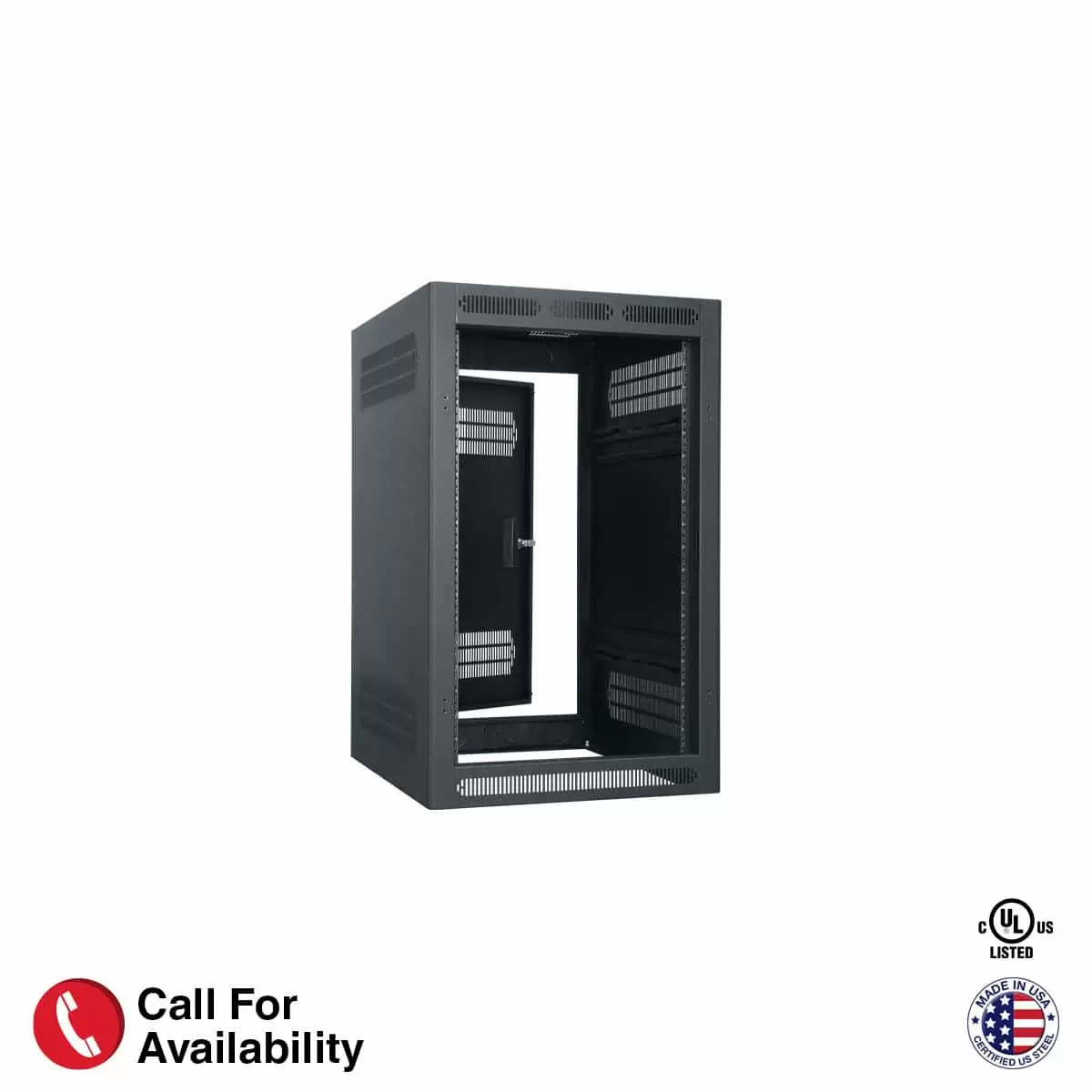 The EIA/TIA-compliant, stand-alone floor rack shall be Lowell Model LER-1827. Overall measurements shall be 37.625″H x 27.00″D x 23.06″W with panel space of 18 units and load capacity of 500 lbs. The rack shall include a recessed rear door with vents and key lock, welded side panels with vents, solid top with vents, open base with grounding stud, one-pair adjustable front mounting rails with printed RU increments, laser-cut combination knockouts above and below rear door, and provisions to mount an optional surface-mount front door or rear rails (ordered separately). The rack shall be manufactured in the USA using USA-certified steel and have a black-textured powder-coat finish. It shall be UL2416 Listed, Trade Agreement Act (TAA) compliant, and Buy American Act (BAA) compliant.