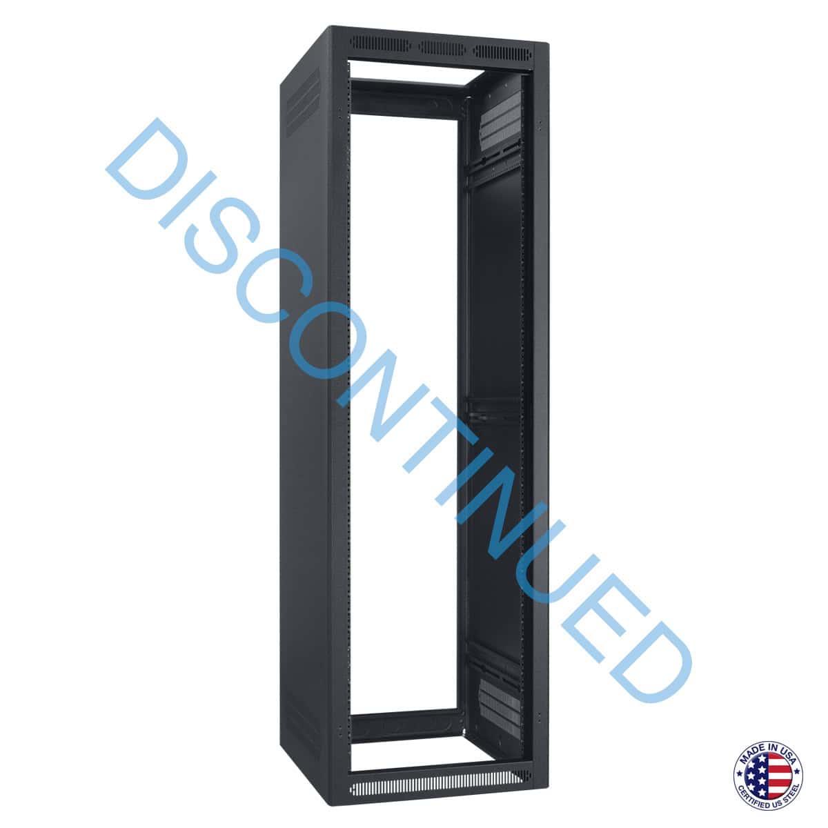 The LER Series 19-inch standalone AV rack is fully welded U.S. steel, reinforced at load-bearing junctions for robust support. Welded side panels feature upper and lower vents for passive ventilation. The rack includes adjustable mounting rails that can be repositioned deeper into the rack as needed to accommodate equipment controls. Beveled corners. Black textured powder coat finish. An optional front door is available separately (LFD Series).