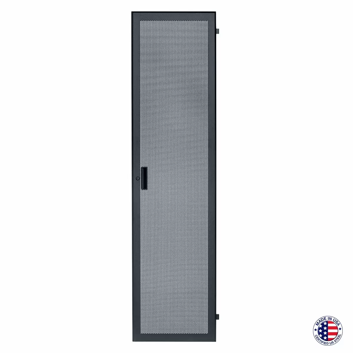 The surface-mount rack front door shall be Lowell Model LFD-_____, which shall measure 20″W x 1″D x ____ rack units. It shall be fully-vented steel. It shall mount to the rack frame with left- or right-hand swing and extend 1 inch. The door shall include an integral recessed handle and key lock. The door shall be manufactured in the USA using USA-certified steel and have a black-textured powder-coat finish. It shall be Trade Agreement Act (TAA) compliant and Buy American Act (BAA) compliant.