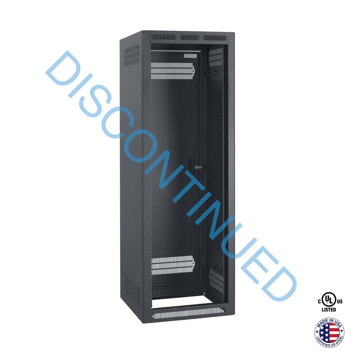 19 inch AV rack features welded sides and a 16-gauge steel frame with 14-gauge bottom reinforced at load-bearing junctions. The fixed-position front rails are a cost-effective solution for equipment that won't need to be moved deeper into the rack. The rack includes a recessed rear door with vents and key lock, plus short rear brackets to allow some repositioning of optional accessories such as rear rails or a vertical-mount power strip (order separately). Black wrinkle powder epoxy finish. Order with a rear door (LFR-3527) or less rear door (LFR-3527-LRD).