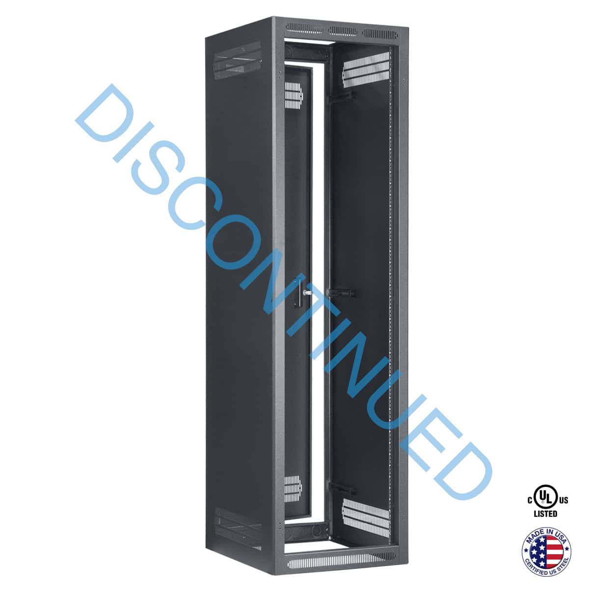 AV rack features welded sides and a 16-gauge steel frame with 14-gauge bottom reinforced at load-bearing junctions. The fixed-position front rails are a cost-effective solution for equipment that won't need to be moved deeper into the rack. The rack includes a recessed rear door with vents and key lock, plus short rear brackets to allow some repositioning of optional accessories such as rear rails or a vertical-mount power strip (order separately). Black wrinkle powder epoxy finish. Order with a rear door (LFR-4427) or less rear door (LFR-4427-LRD).