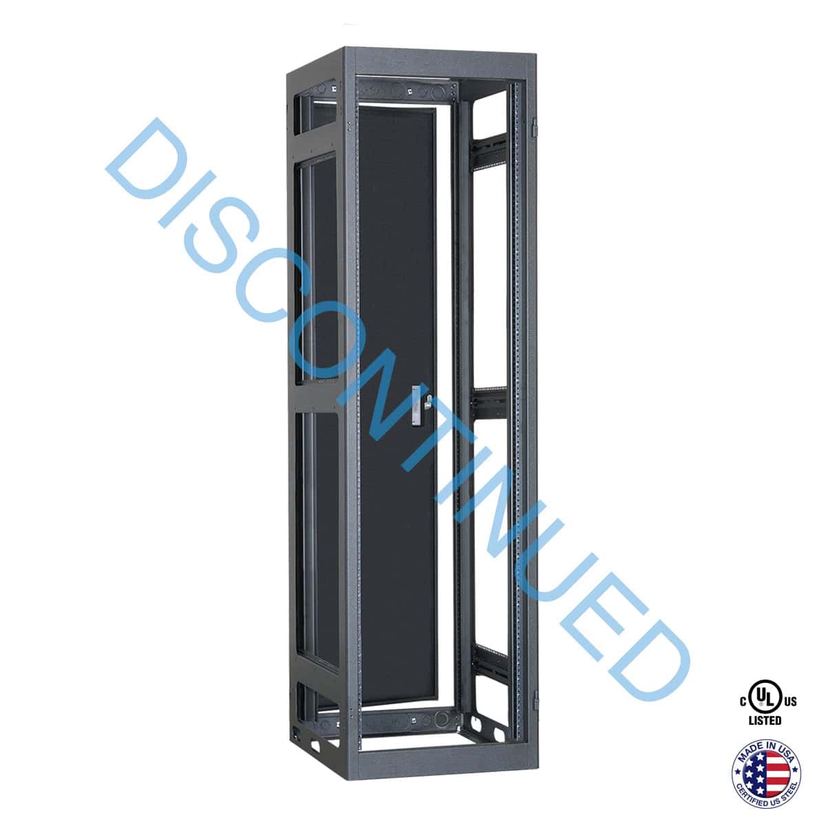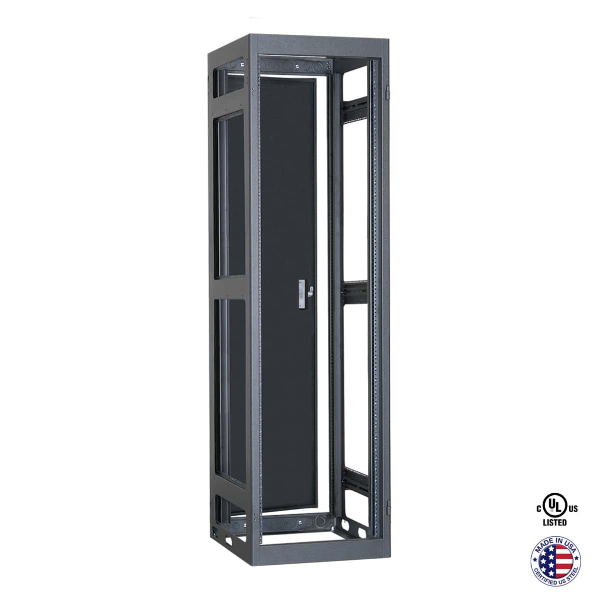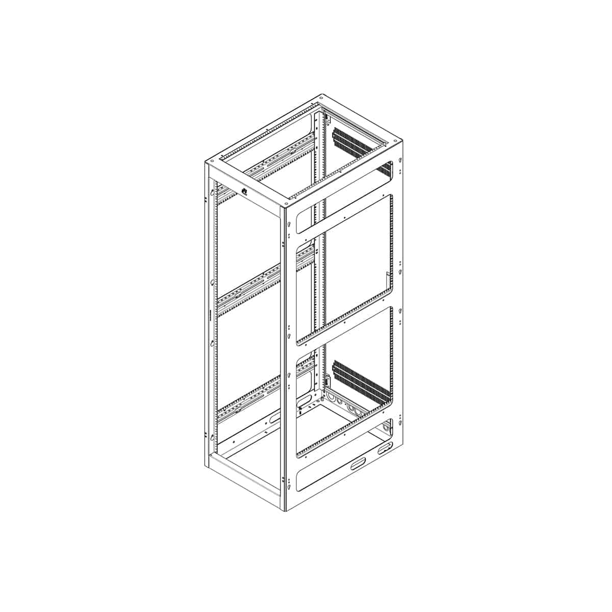 The EIA/TIA compliant, UL Listed gangable equipment rack shall be Lowell Model LGNR-3732, which shall measure 22″W x 32″D x 70.875″H (37U). The rack shall be UL Listed in the U.S. and Canada with a load capacity of 3150 lbs. Construction shall be fully welded 16-gauge steel frame with 14-gauge steel top and 14-gauge steel bottom reinforced at loadbearing junctions and have a black wrinkle powder epoxy finish. The rack shall include a solid steel rear door with key lock and two pairs of 11-gauge steel adjustable rails with mounting holes tapped 10-32 and rack unit increments printed on EIA spacing. The rear frame shall feature removable knockout panels and combination knockouts (1/2″, 3/4″, 1″, 1-1/2″) for conduit wiring, and BNC knockouts for UHF/VHF antenna. The top shall feature a 15U opening and includes rails with mounting holes tapped 10-32 to accept 19″W solid panels included as shipping stiffeners or optional accessories. The base shall include a grounding stud.