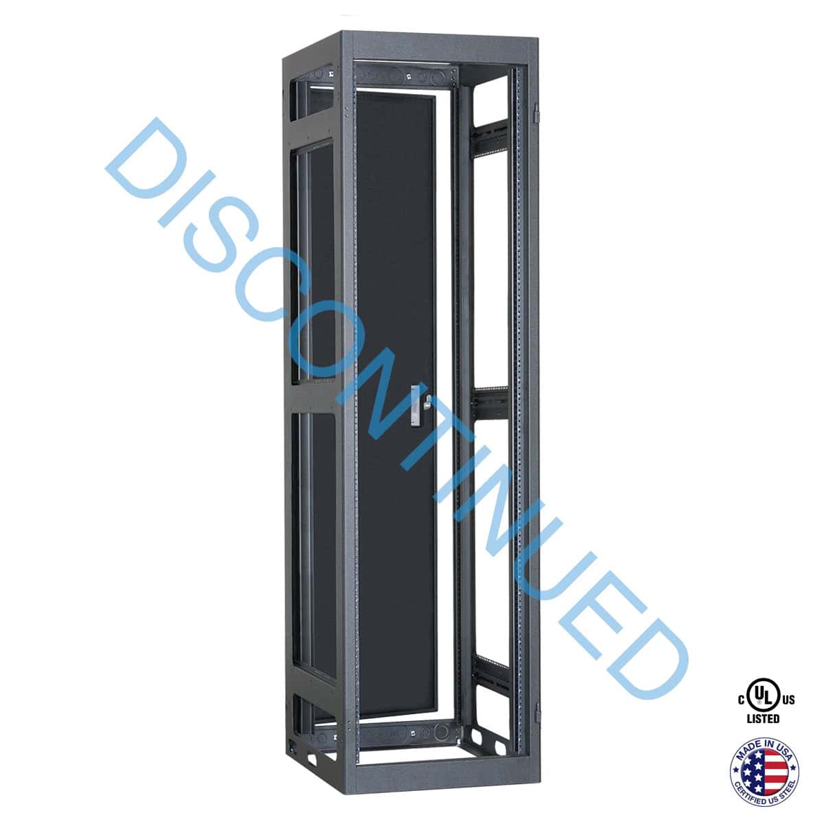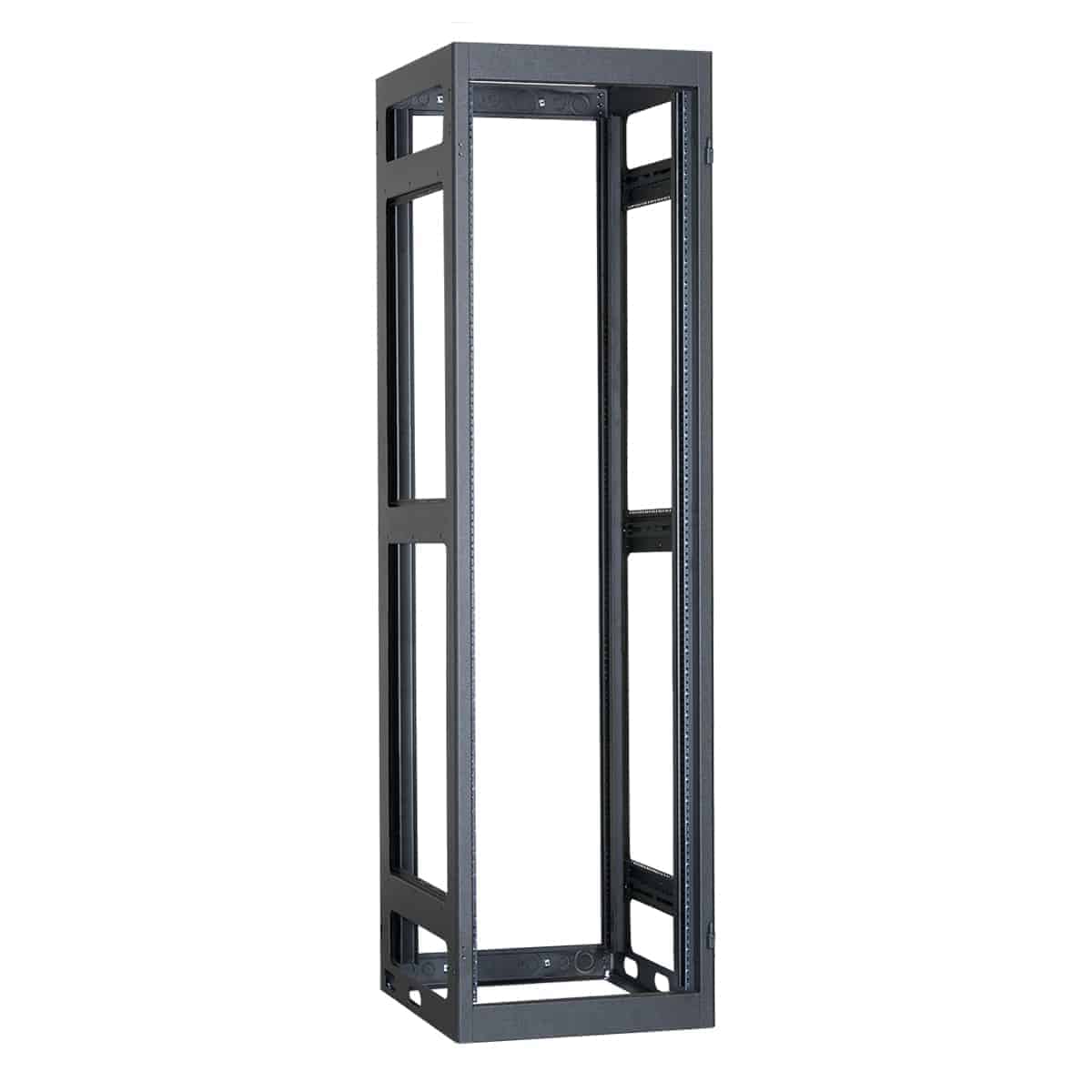 The EIA/TIA compliant, UL Listed gangable equipment rack shall be Lowell Model LGNR-4036, which shall measure 22″W x 36″D x 76.125″H (40U). The rack shall be UL Listed in the U.S. and Canada with a load capacity of 3150 lbs. Construction shall be fully welded 16-gauge steel frame with 14-gauge steel top and 14-gauge steel bottom reinforced at loadbearing junctions and black wrinkle textured powder epoxy finish. The rack shall include a solid steel rear door with key lock and two pairs of 11-gauge steel adjustable rails with mounting holes tapped 10-32 and rack unit increments printed on EIA spacing. The rear frame shall feature removable knockout panels and combination knockouts (1/2″, 3/4″, 1″, 1-1/2″) for conduit wiring, and BNC knockouts for UHF/VHF antenna. The top shall have integral rails with mounting holes tapped 10-32 to accept 19″W solid panels included as shipping stiffeners or optional accessories. The base shall include a grounding stud and provisions to accept optional leg levelers or anchor bolts (not included).
