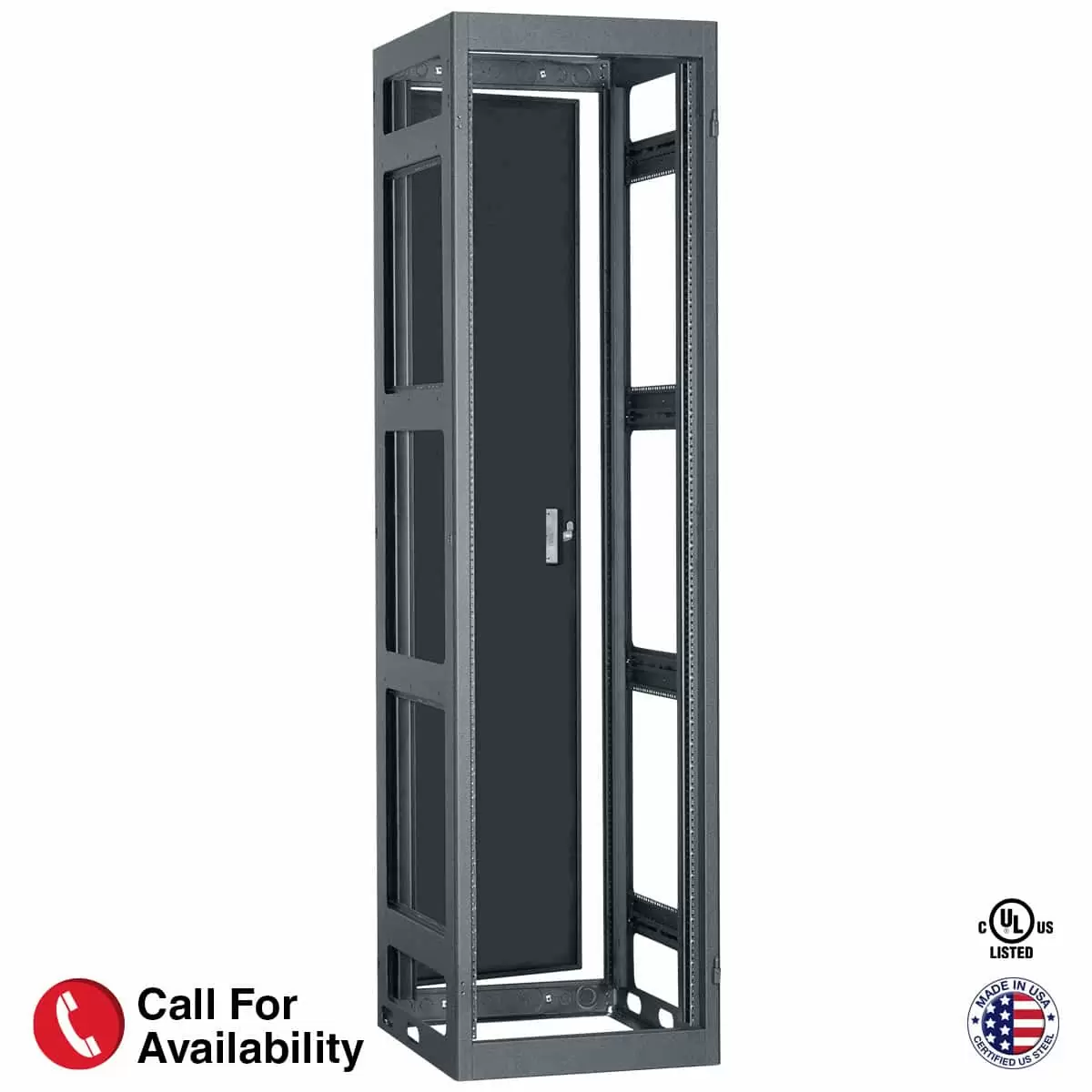 The EIA/TIA-compliant, gangable equipment rack shall be Lowell Model LGNR-4432, which shall measure 22″W x 32″D x 83.125″H (44U). Construction shall be fully-welded 16-gauge steel frame with 14-gauge steel top and 14-gauge steel bottom reinforced at loadbearing junctions. The rack shall include a solid steel rear door with key lock and two-pairs of 11-gauge steel adjustable rails with mounting holes tapped 10-32 and rack unit increments printed on EIA spacing. The rear frame shall feature combination knockouts (1/2″-3/4″, 1/2″-1″, 3/4″-1″, 1″-1-1/2″ and 1″-2″ KOs) for conduit wiring, and BNC knockouts for UHF/VHF antenna. The top shall have integral rails with mounting holes tapped 10-32 to accept 19″W solid panels optional accessories. The base shall include a grounding stud and provisions to accept leg levelers (optional) or anchor bolts (by others). The rack shall be manufactured in the USA using USA-certified steel and have a black-textured powder-coat finish. It shall be UL 2416 Listed, Trade Agreement Act (TAA) compliant, and Buy American Act (BAA) compliant.