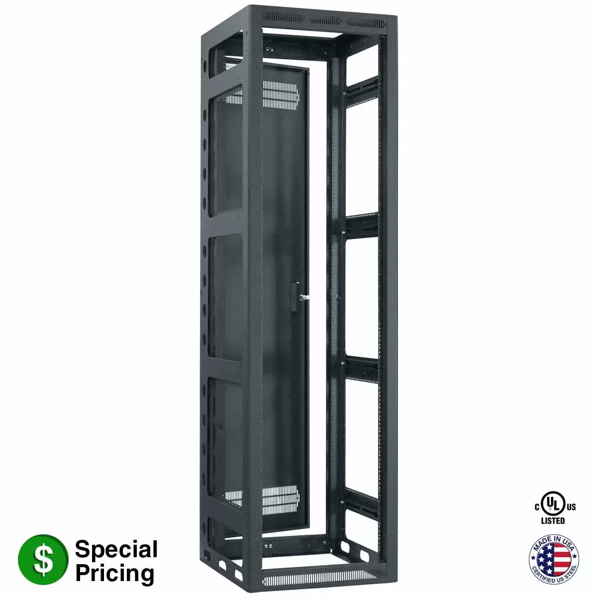 - Open frame with multiple 2 in. holes on sides for cable runs between racks