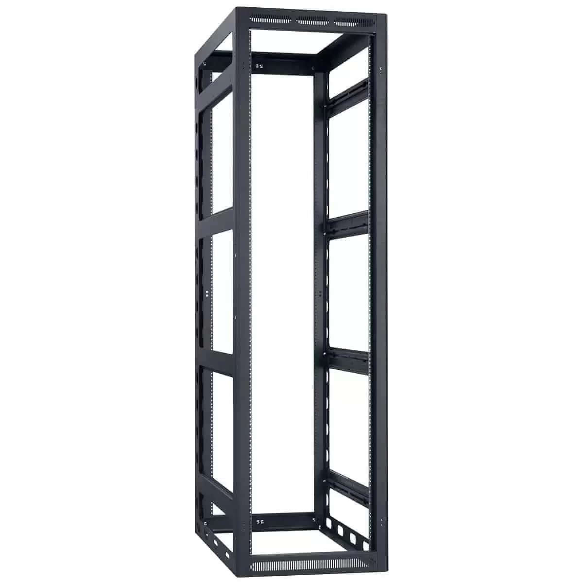 The EIA/TIA-compliant, gangable rack shall be Lowell Model LGR-4436. Overall measurements shall be 83.125″H x 36″D x 23.06″W with panel space of 44 rack units. Load capacity shall be 3150 lbs. The rack shall include a recessed rear door with vents and key lock; top with 12U opening; open base with grounding stud; two-pairs adjustable mounting rails with printed RU increments; knockout panels with combination knockouts above/below rear door; and provisions to mount an optional surface-mount front door (ordered separately). The rack shall be manufactured in the USA using USA-certified steel and have a black-textured powder-coat finish. It shall be UL2416 Listed, Trade Agreement Act (TAA) compliant, and Buy American Act (BAA) compliant.