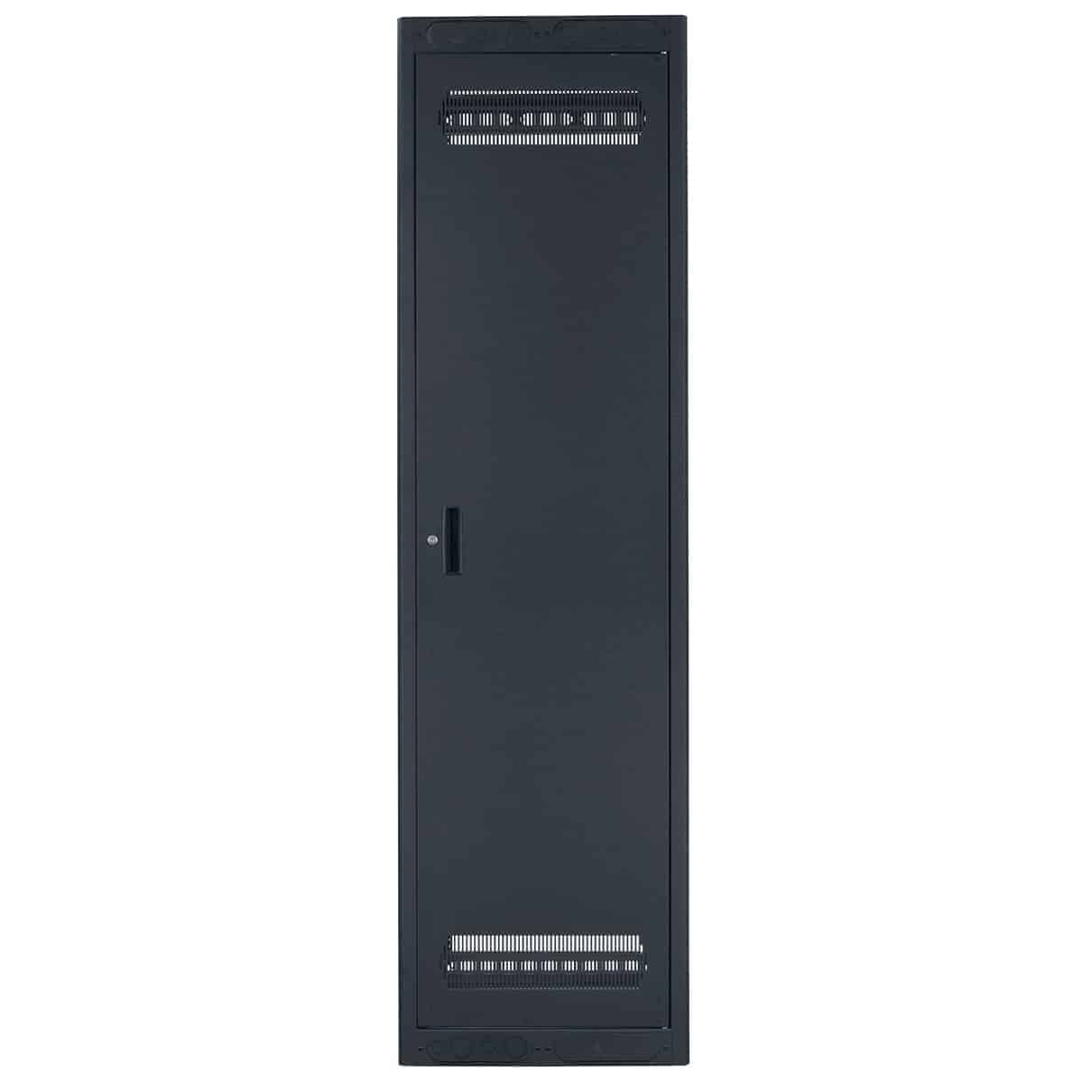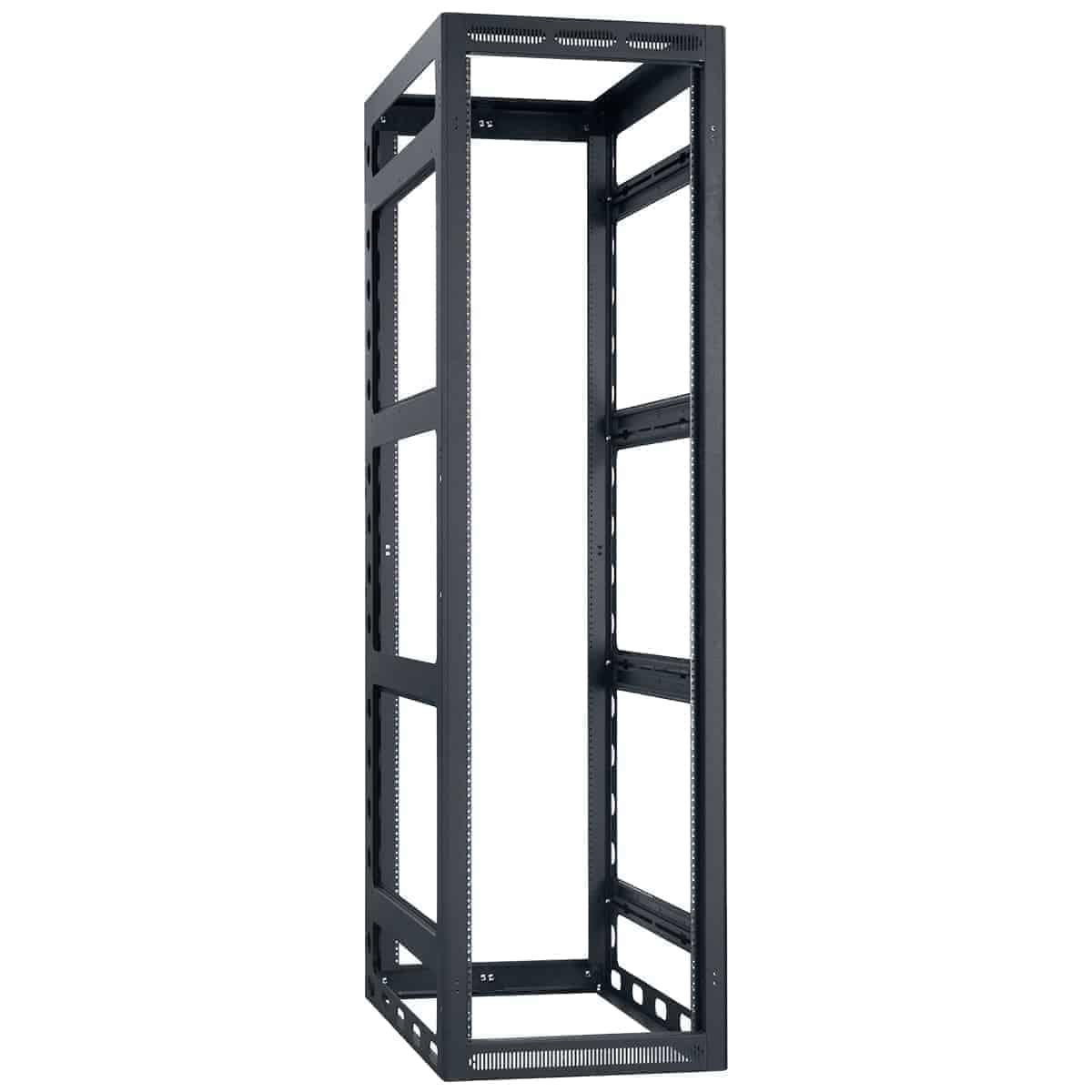 The EIA/TIA-compliant, gangable rack shall be Lowell Model LGR-4442. Overall measurements shall be 83.125″H x 42″D x 23.06″W with panel space of 44 rack units. Load capacity shall be 3150 lbs. The rack shall include a recessed rear door with vents and key lock; top with 12U opening; open base with grounding stud; two-pairs adjustable mounting rails with printed RU increments; knockout panels with combination knockouts above/below rear door; and provisions to mount an optional surface-mount front door (ordered separately). The rack shall be manufactured in the USA using USA-certified steel and have a black-textured powder-coat finish. It shall be UL2416 Listed, Trade Agreement Act (TAA) compliant, and Buy American Act (BAA) compliant.