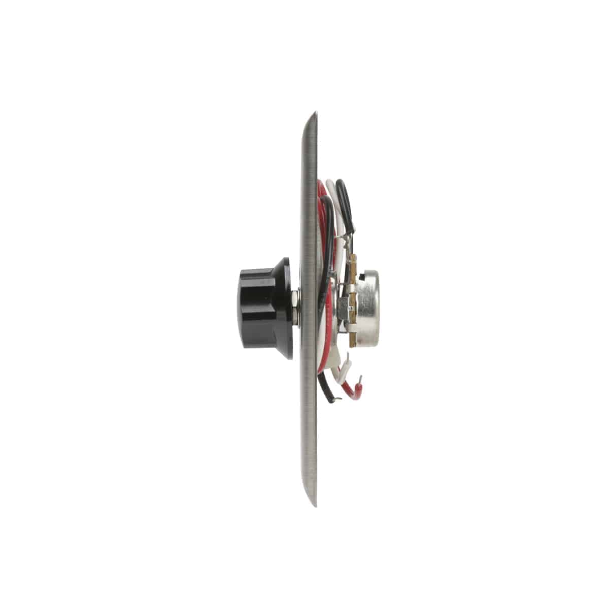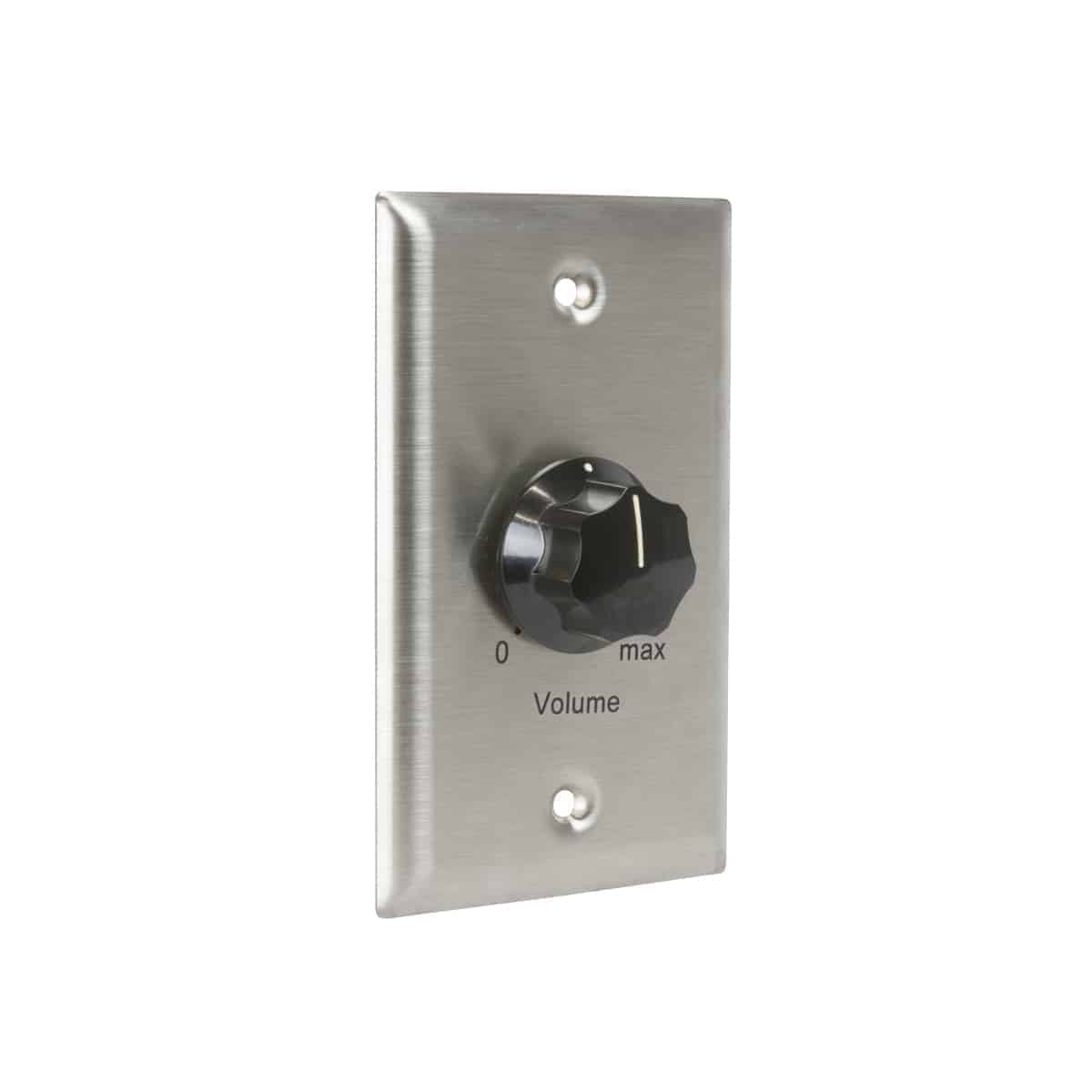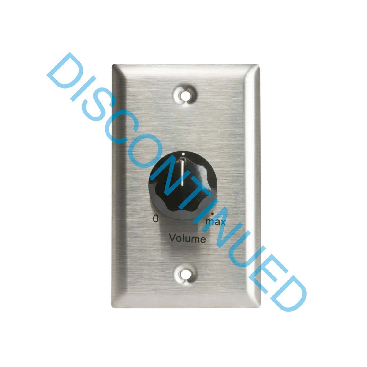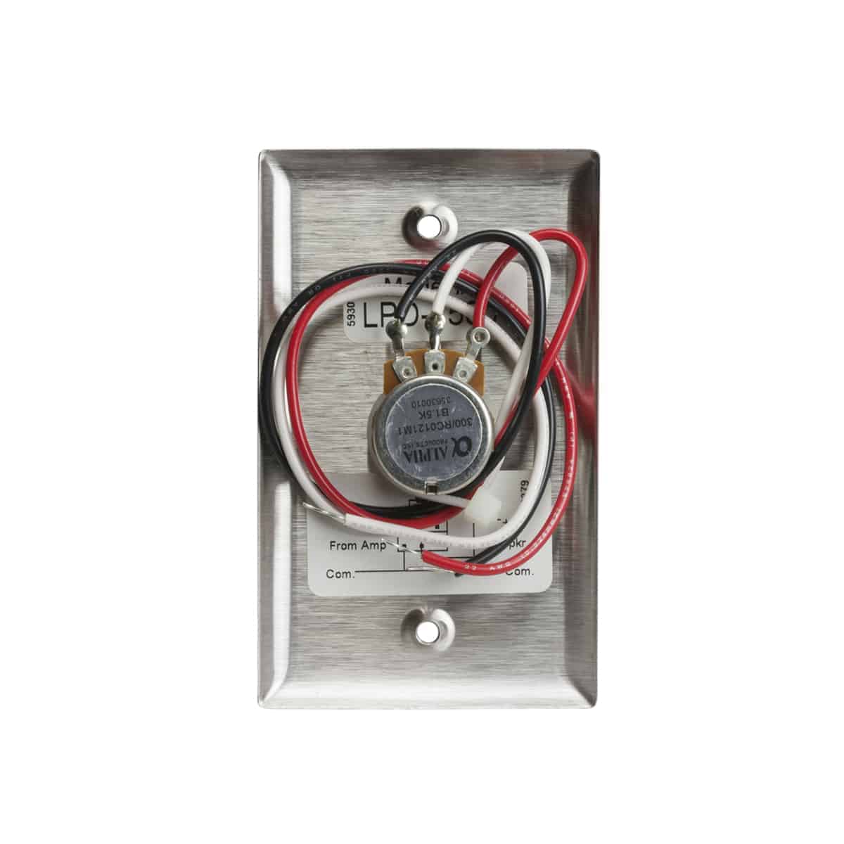 The wirewound L-pad control shall be Lowell Model LPD-1500S, which shall provide a contant 1500 ohm load to the power source. Attenuation shall be continuous with a stop at minimum and maximum. The attached one-gang, stainless steel faceplate shall feature a stamped and paint filled dial scale, fluted black knob and mounting screws.