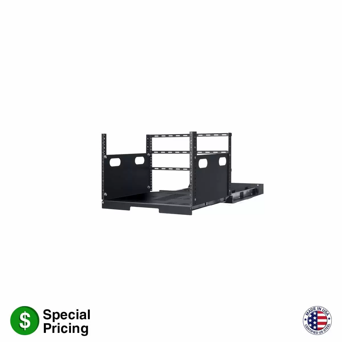 Designed for built-in applications, the rack base can be mounted flush or recessed up to 2 inches in boxed wall or cabinetry. The top mounting section is secured in position with a front panel. Remove the panel to slide the top section forward on two support rails set into the base, and access mounted equipment and connections. Ships unassembled.