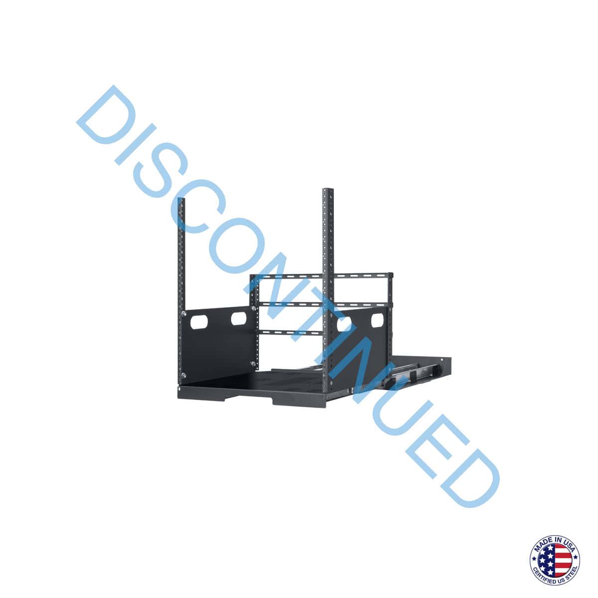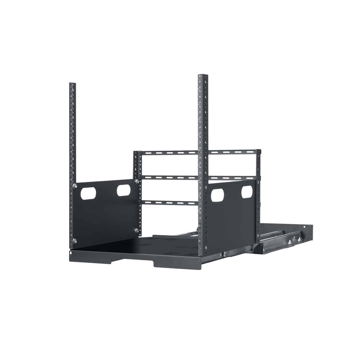 The rack for built-in use shall be Lowell Model LPOR4-1219 which shall measure 19.13”W x 19.49”D x 22.95”H and provide 12 rack units of panel space (12U front rails, 7U rear rails). The rack shall be made with certified U.S. steel and feature a 14-gauge steel base and 11-gauge steel mounting rails tapped 10-32. The base shall feature four heavy duty rails which shall allow the rack to slide forward while supporting a load up to 250 lbs. The rack shall include three cable lacing bars in the rear and a front panel which shall mount with screws to secure rack in roll-back position. The rack shall have a smooth black powder epoxy finish and ship unassembled in two cartons.