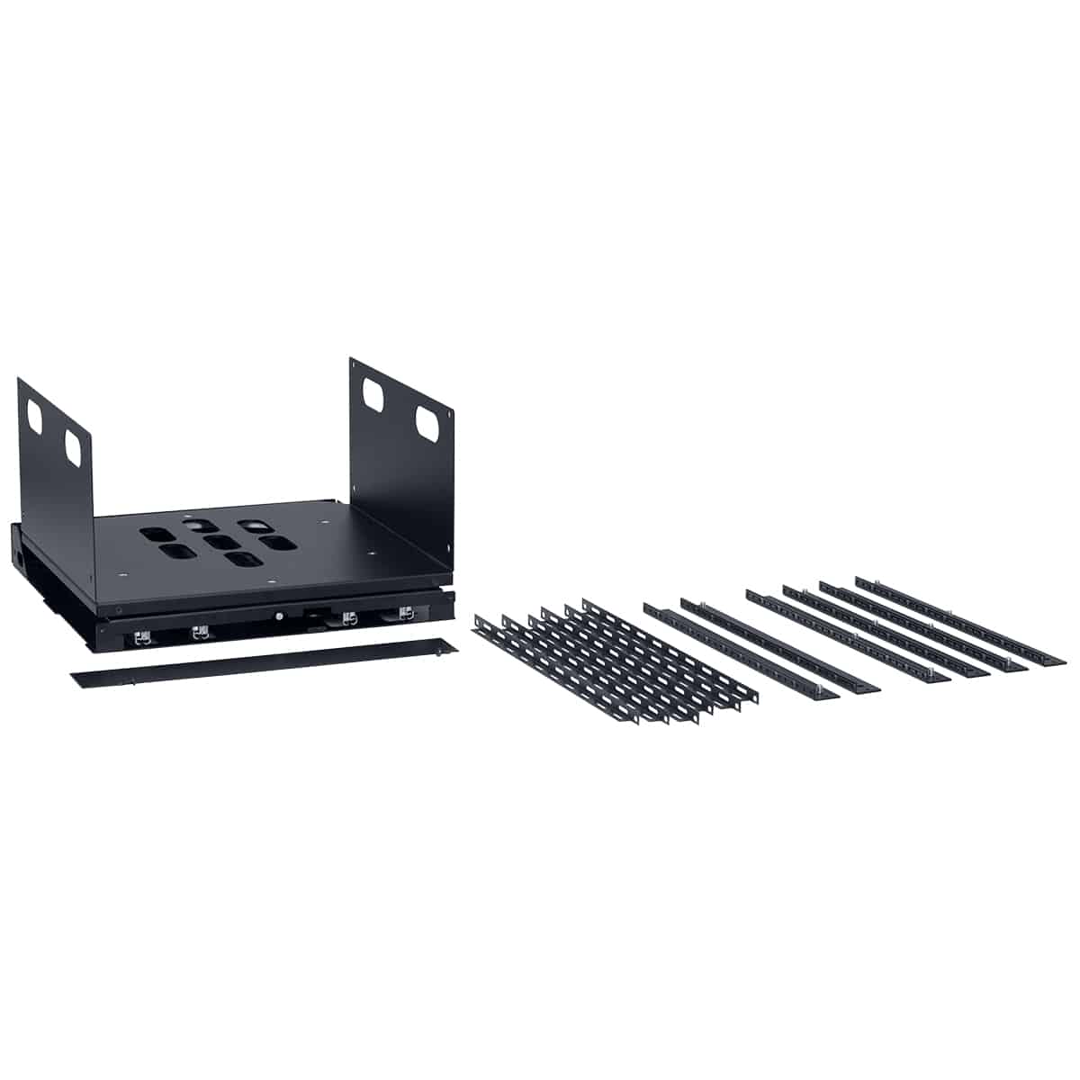 The rack for built-in applications shall be Lowell Model LPTR4-1023 which shall be constructed from USA-certified steel. Overall measurements shall be 20.15″H x 19.13″W x 23.69″D with 10U panel space. The base shall feature four bottom rails and integral turntable to allow the rack to slide forward, rotate and lock at 60 or 90 degrees. The rack shall include six cable lacing bars, a front securing/finishing panel and side supports with obround openings. Load capacity shall be 200 lbs. The rack shall ship unassembled in two cartons. The rack shall be manufactured in the USA using US and global components and have a smooth-black powder-coat finish. It shall be Trade Agreement Act (TAA) compliant and Buy American Act (BAA) compliant.